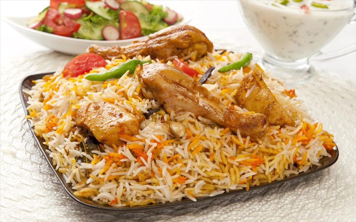 Μείγμα ρυζιού μπασμάτι, κοτόπουλο, γιαούρτι, λεμόνι, μπαχαρικά masala, φύλλα κόλιαντρου και τηγανητό κρεμμύδι είναι τα απαραίτητα υλικά για Hyderabadi Biryani