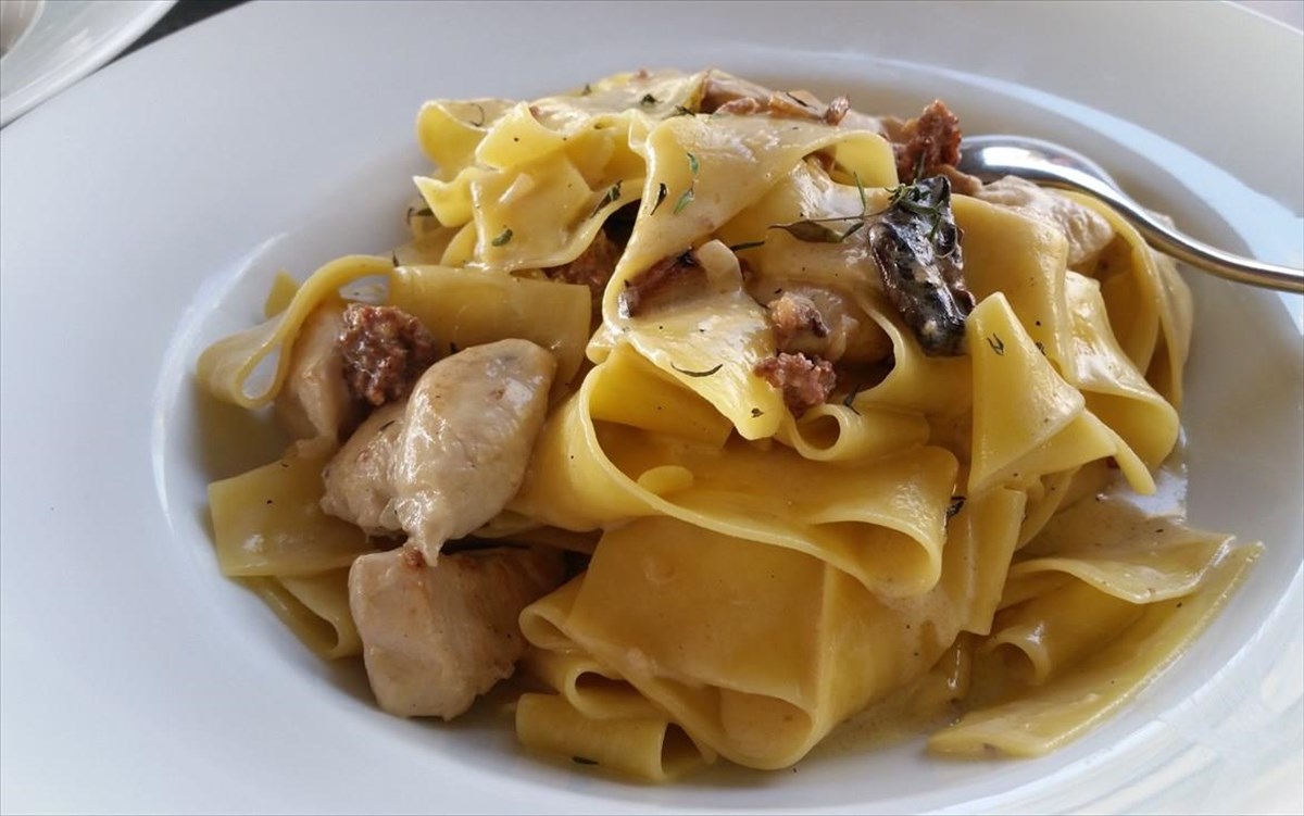 Παπαρδέλες, κοτόπουλο, chorizo, κρέμα σε ένα πιάτο όλο φρεσκάδα
