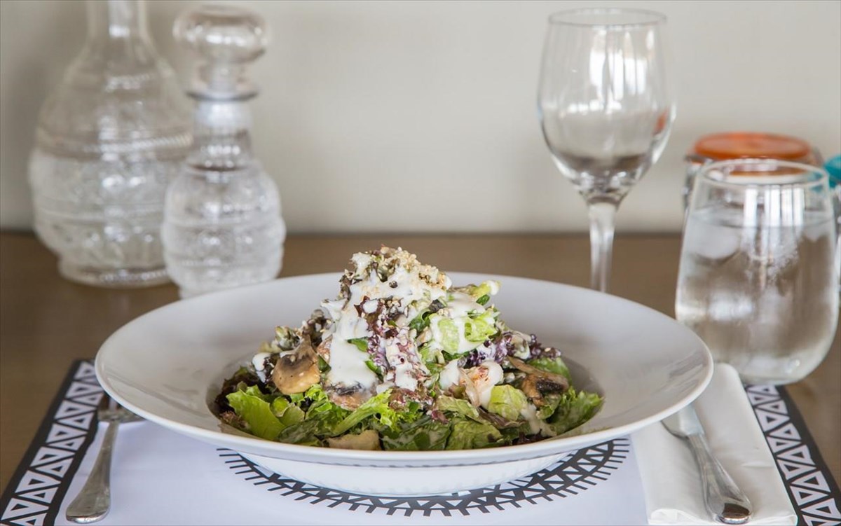 Η πράσινη σαλάτα με μαριναρισμένα μανιτάρια, μπουκιές κοτόπουλου και ντρέσινγκ με γιαούρτι και οξύμελι (κοινώς ξιδόμελο, που αποτελεί και από τα κύρια ροφήματα της Ιατρικής του Ιπποκράτη) έφτασε σε γενναία μερίδα, δροσερή, με γλυκιά επίγευση, ελαφρύ άρωμα σκόρδου και χορταστική, τόσο λόγω μεγέθους, αλλά και λόγω των μπουκιών κοτόπουλου και των μανιταριών που χάριζαν πρωτεΐνη και ενέργεια στο πιάτο.