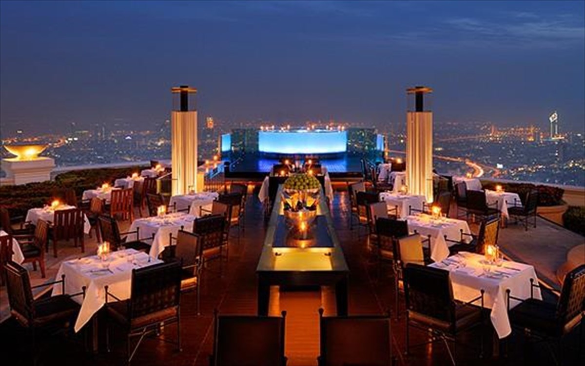 www.lebua.comΚατακτά την κορυφή της λίστας με τα υψηλότερα υπαίθρια εστιατόρια του κόσμου, αφού βρίσκεται στον 63ο όροφο του ξενοδοχείου Lebua στην Μπανγκόκ. Λέγεται Sirocco, το μενού του απαρτίζεται από διεθνή κουζίνα που συνοδεύεται από jazz υπόκρουση και στον ίδιο χώρο στεγάζεται και το Sky Bar, ένα από τα καλύτερα μπαρ σε ταράτσα.