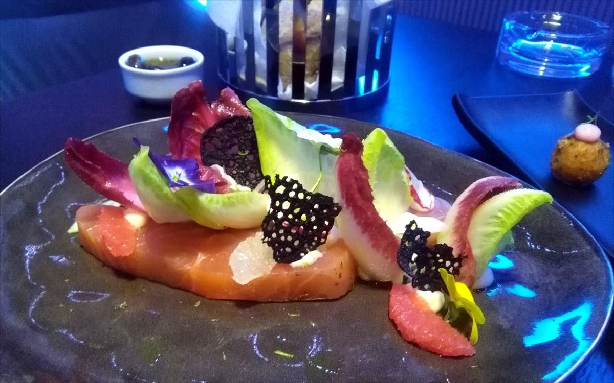 Ο μαριναρισμένος σολομός (13 ευρώ) που επιλέξαμε για τη συνέχεια ήταν άκρως εντυπωσιακός ως προς την παρουσίαση, με λουλούδια στο πιάτο (τα οποία γενικά «έπαιζαν πολύ») παρουσιάζοντας ένα πολύχρωμο έργο (γαστρονομικής) τέχνης. Ήταν τρυφερός, δροσερός, με πλούσια γεύση και τα ιδιαίτερα μαύρα τσιπς από μελάνι σουπιάς χάριζαν τραγανή υφή και αλμυρή γεύση στην κάθε μπουκιά, ενώ δεν έλειπε και η οξύτητα από το γκρέιπφρουτ, όπως και η ιδιαιτερότητα του κάρυ. Αλμυρό, ξινό, δροσερό, τρυφερό, μαλακό, όλα μαζί έφερναν την ισορροπία.