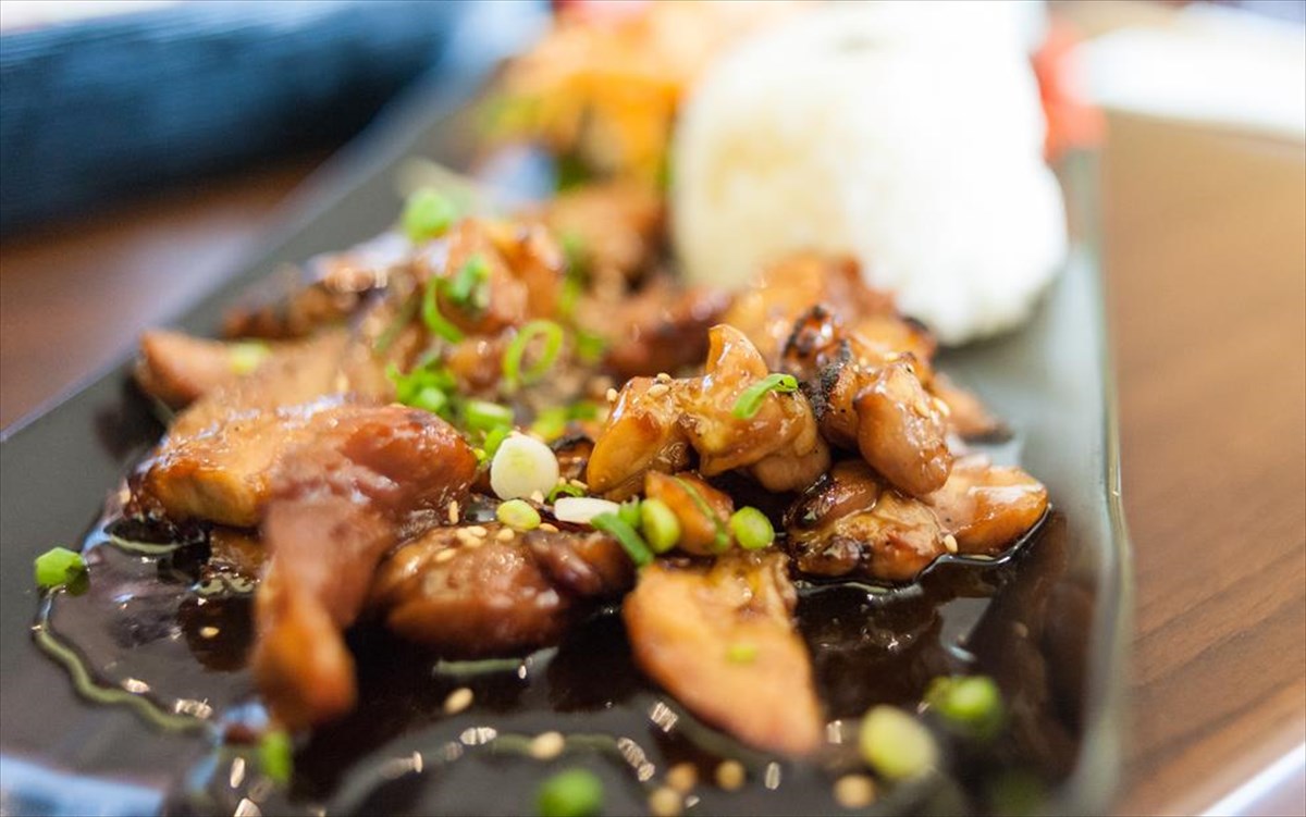Chicken Teriyaki: καλαμάκια κοτόπουλου στη σχάρα μαριναρισμένα σε σάλτσα τεριγιάκι (€5)