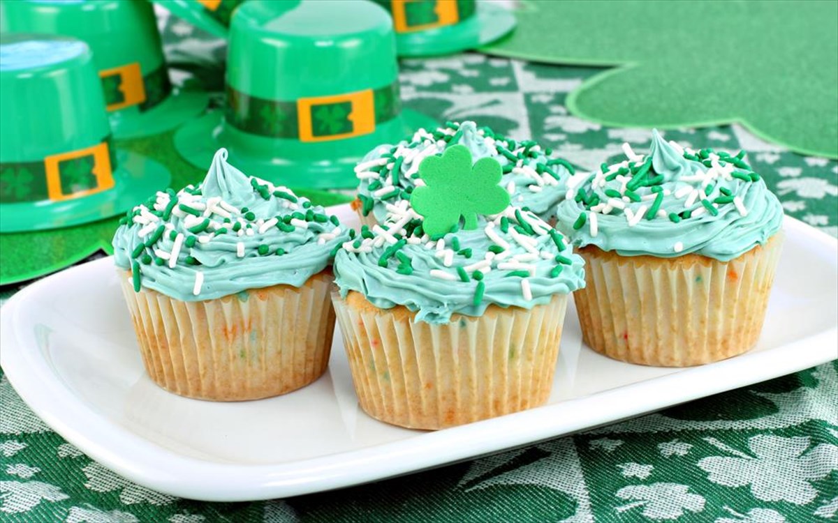 Aπό τα πιο αγαπημένα γλυκά της ημέρας, τα cupcakes παίρνουν το χρώμα τους και πάλι από μερικές σταγόνες πράσινου χρώματος ζαχαροπλαστικής στο γλάσο, έτσι ώστε να πάρει το χρώμα της ημέρας. Πολλοί συνηθίζουν να σχηματίζουν τριφύλλι με το γλάσο ή να φτιάχνουν μικρά τριφύλλια για γαρνιτούρα με ζύμη ή παντεσπάνι.