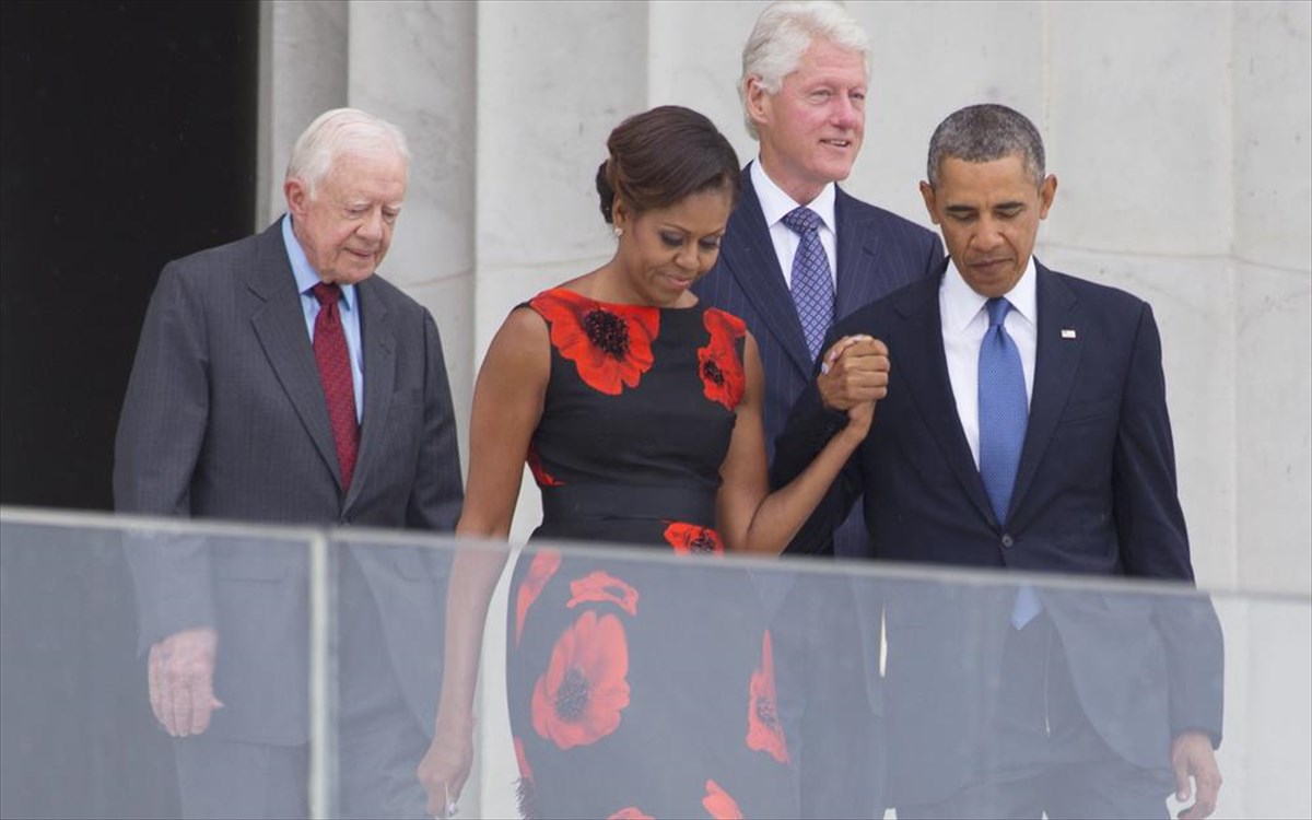 Εκεί που η Michelle Obama κρατούσε ισορροπίες με Αμερικανούς σχεδιαστές και ιστορικούς οίκους, ο Barack Obama φορούσε κυρίως μπλε κοστούμια, μαύρα σμόκιν και λευκά πουκάμισα.