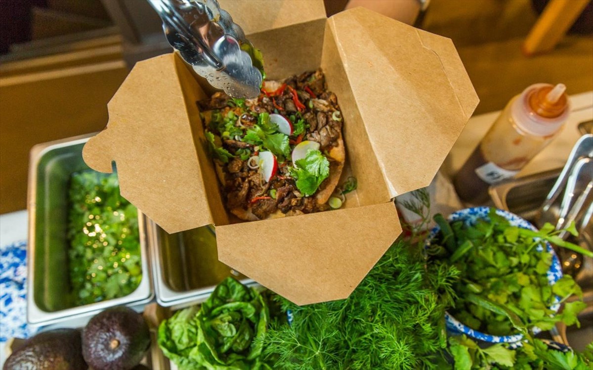 Στο κέντρο, μάλιστα υπάρχει και ένα κεντρικό θερμαινόμενο τραπέζι που αποτελεί τον τελευταίο σταθμό πριν τον πελάτη. Δημιουργώντας μία ανοιχτή αγορά σε κοινή θέα, δίνεται η δυνατότητα να γίνει κάποιος μάρτυρας ολόκληρης της διαδικασίας παρασκευής: δημιουργία της ζύμης, διαχείριση των λαχανικών, ψήσιμο του κρέατος.