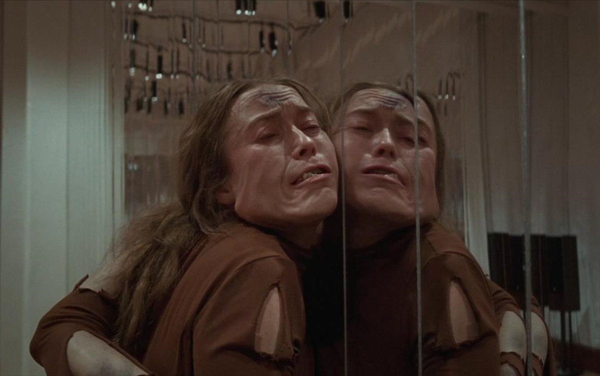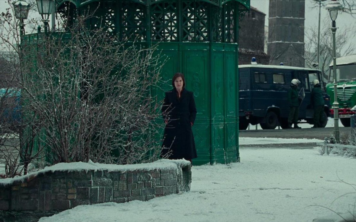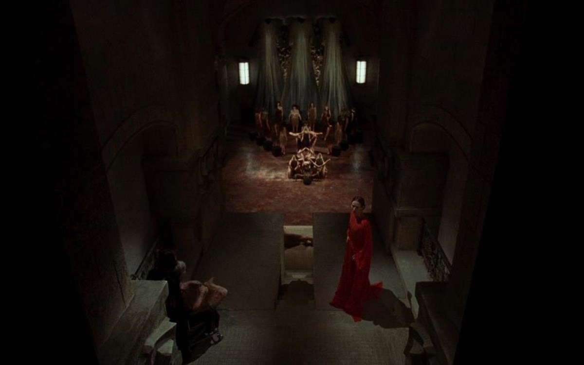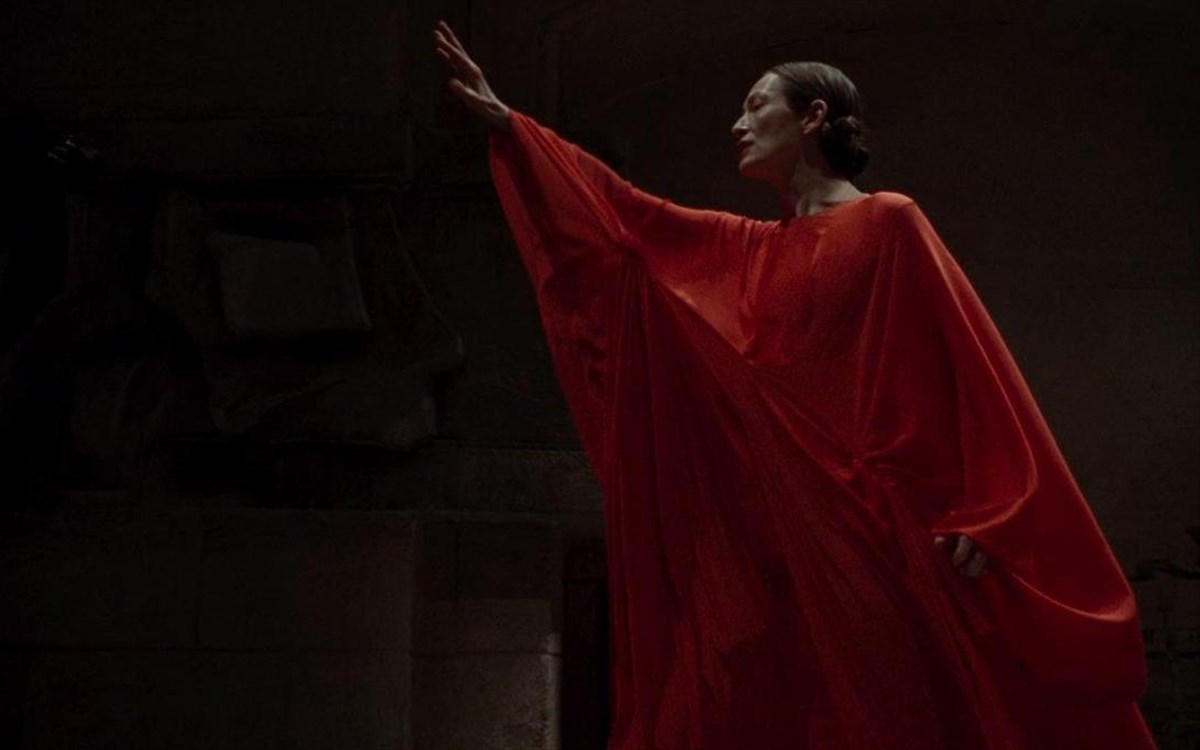 Και αν ο Guadagnino στολίζει τα εξωτερικά πλάνα με την επικαιρότητα (όχι μόνο πολιτική, για παράδειγμα ακούμε κάποια στιγμή την είδηση πως θα μιλήσει ο Λακάν) και τα καιρικά φαινόμενα, στα εσωτερικά πλάνα δεσπόζει η μπαρόκ αισθητική του επιβλητικού κτηρίου της σχολής με σκάλες, καθρέφτες, μεγάλους διαδρόμους και γκρίζα, γήινα χρώματα- καμία σχέση με την τεχνικολόρ παλέτα του Argento δηλαδή- μέχρι να σπάσει τη μουντίλα τους το κόκκινο. Και μέσα σε αυτό το μουντό κτήριο κρατάει την κάμερά του από πολύ ψηλά ή μέσα από παράθυρα και πόρτες, εκμεταλλεύεται τα είδωλα που δημιουργούνται στους καθρέφτες και τις σκιές που φτιάχνει το σκοτάδι, αποθεώνει με κοντινά πλάνα τη σταθερή πια συνεργάτιδά του, Tilda Swinton, προσαρμόζει εξαιρετικά το μοντάζ του (κοφτό και γρήγορο cut στους εφιάλτες- αναμνήσεις, cross-cutting/παράλληλο μοντάζ στη σκηνή της πρόβας, dissolve όταν συναθροίζονται πολλοί στο κάδρο) και τέλος, φτιάχνει απόλυτα σωματικά πλάνα εστιάζοντας στην κίνηση του κορμιού που κινείται με βάση μια χορογραφία.