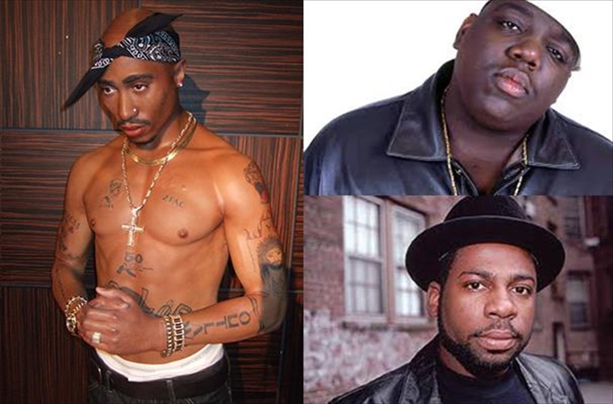 Aριστερά: Tupac Shakur, Δεξιά πάνω: Notorious B.I.G., Δεξιά κάτω: Jam Master Jay