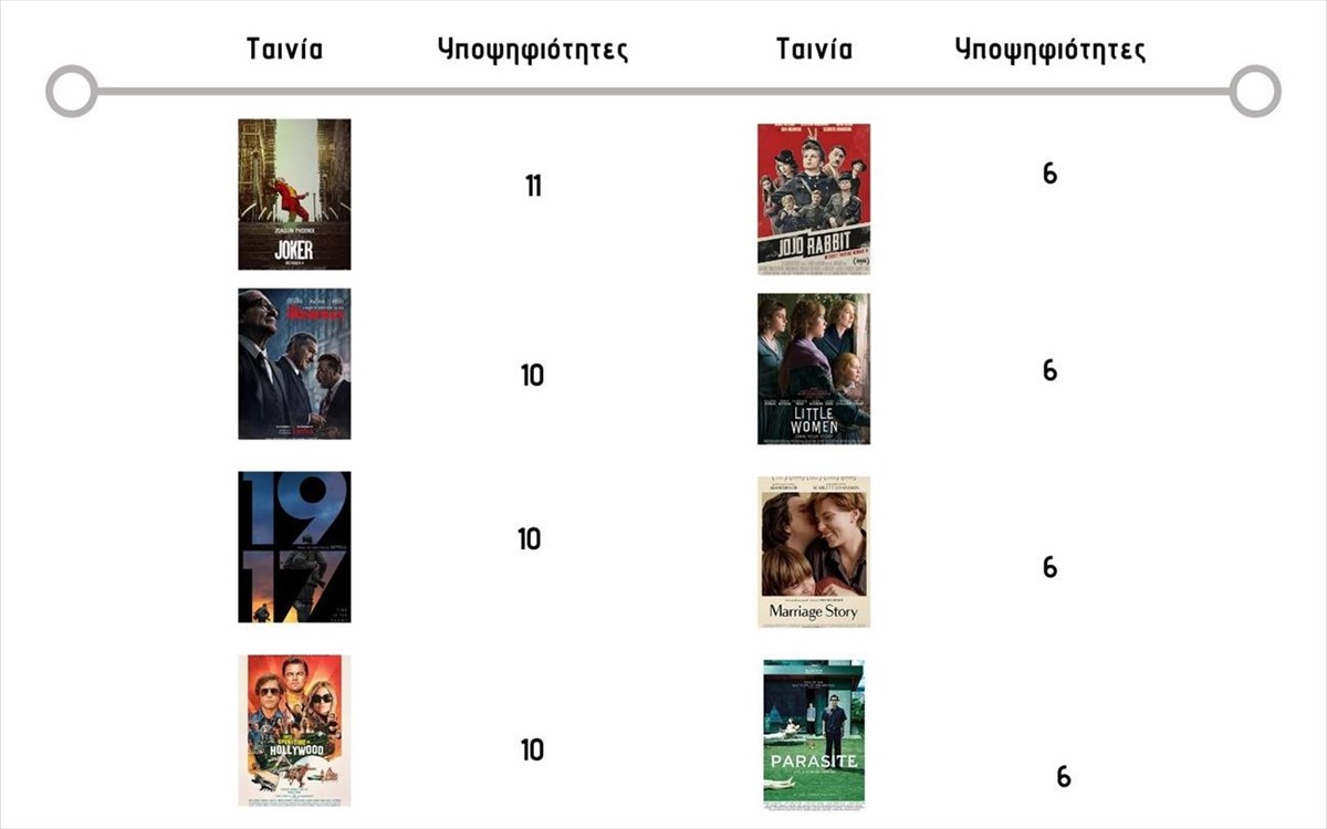 «Παράσιτα», «Joker», «Τζότζο», «Κόντρα σε Όλα», «Ο Ιρλανδός», «Μικρές Κυρίες», «Ιστορία Γάμου», «1917» και «Κάποτε… στο Χόλιγουντ» είναι οι εννιά υποψήφιες ταινίες για το Όσκαρ Καλύτερης Ταινίας.