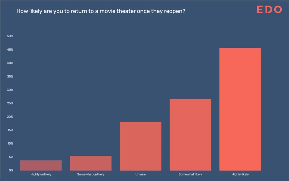 Αντίστοιχα όμως το 45% των ερωτηθέντων είναι πιο διστακτικό δηλώνοντας πως θα περιμένει «λίγες εβδομάδες» μετά το άνοιγμα των αιθουσεών, ενώ το 11% «αρκετούς μήνες» μετά την επαναλειτουργία. Παρά την αβεβαιότητα, τα νέα είναι θετικά για την βιομηχανία του κινηματογράφου, καθώς οι ζημιές από την πανδημία έχουν εκτιμηθεί πως θα ξεπεράσουν τα 20 δισεκατομμύρια δολάρια.