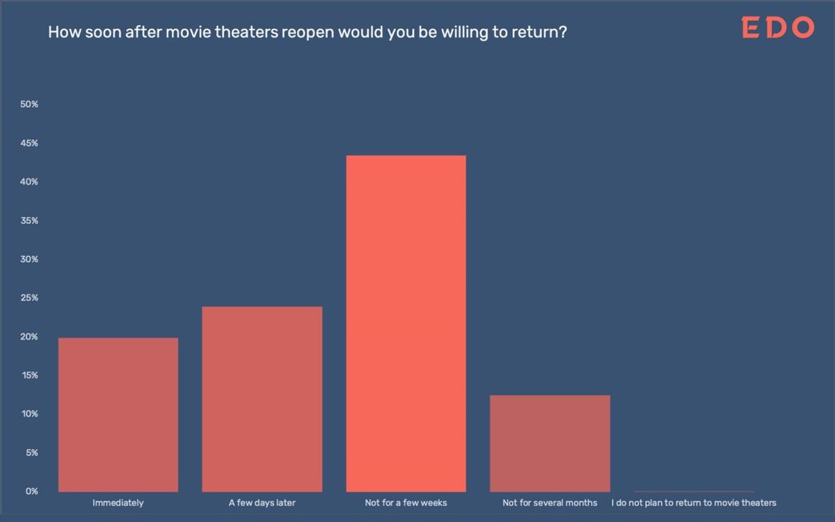 EDOΗ έρευνα έδειξε επίσης πως υπάρχει διχογνωμία σχετικά με το πόσο σύντομα μετά την επαναλειτουργία σκοπεύει να επιστρέψει ο κόσμος στις αίθουσες, με το 45% να δηλώνει σχετικά σύντομα και πιο συγκεκριμένα το 20% «αμέσως» και το 25% «λίγες μέρες αργότερα».