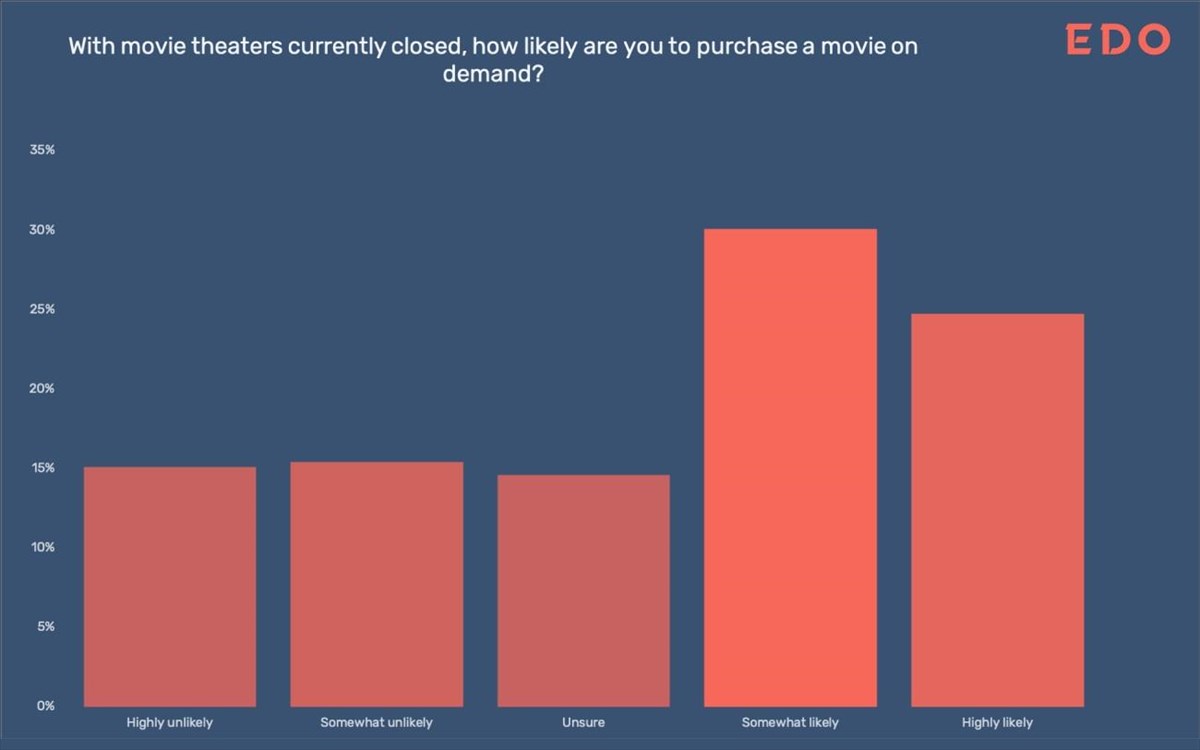 EDOΑναφορικά με τις προτιμήσεις τους κατά διάρκεια της «καραντίνας», περίπου το 75% δήλωσε πως είναι «αρκετά πιθανό» να πληρώσουν για on-demand υπηρεσίες. Λόγω της πανδημίας του κορωνοϊού πολλά στούντιο έχουν αναβάλει τις επίσημες πρεμιέρες των νέων παραγωγών, ενώ έχουν ρίξει μεγάλη έμφαση στην διανομή μέσω πλατφόρμων streaming.