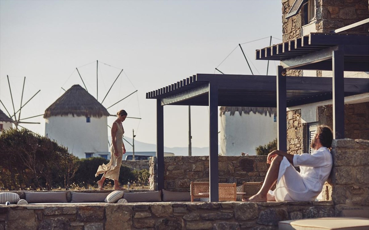 Και όλα αυτά σε ένα περιβάλλον όπου κυριαρχεί το σήμα κατατεθέν του νησιού, οι ανεμόμυλοι της Μυκόνου, ένα κομμάτι ζωντανό παρελθόν που ισορροπεί ανάμεσα στον ουρανό και τη θάλασσα. Όσο για το λαμπερό φως του Αιγαίου που λούζει το εστιατόριο όλη τη μέρα, τις απογευματινές ώρες χαρίζει στους καλεσμένους ένα από τα ωραιότερα ηλιοβασιλέματα στο νησί.