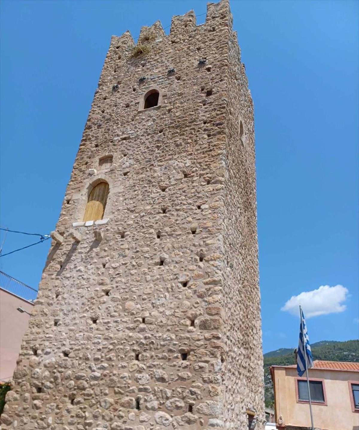 Στο κέντρο του χωριού Πολιτικά, δίπλα στο ναό της Μεταμόρφωσης του Σωτήρος, διατηρείται ο μεσαιωνικός πύργος, έδρα του φεουδάρχη της περιοχής και οικονομικό κέντρο. Το ογκώδες, αμυντικό κτίσμα, έχει την τυπική για την περίοδο της Λατινοκρατίας μορφή. Ο τετραγωνικός πύργος διαρθρώνεται σε τέσσερις ορόφους. Ο κατεξοχήν χώρος διαμονής διαμορφώνεται στον τρίτο όροφο με μεγάλα παράθυρα και τζάκι. Η κύρια είσοδος του πύργου, στην οποία έφθανε κανείς από εξωτερική ανασυρόμενη ξύλινη σκάλα, ανοίγεται στον δεύτερο όροφο, ενώ η σημερινή είσοδος του ισογείου ανοίχτηκε σε μεταγενέστερη εποχή, το 1973. Ο πύργος σήμερα είναι επισκέψιμος έπειτα από τις εργασίες αποκατάστασής του στο πλαίσιο του ΕΣΠΑ (2011-2014). Στους χώρους του λειτουργεί φωτογραφική έκθεση τόσο για τις αναστηλωτικές εργασίες όσο και για την ζωή των ανθρώπων την περίοδο της Λατινοκρατίας.