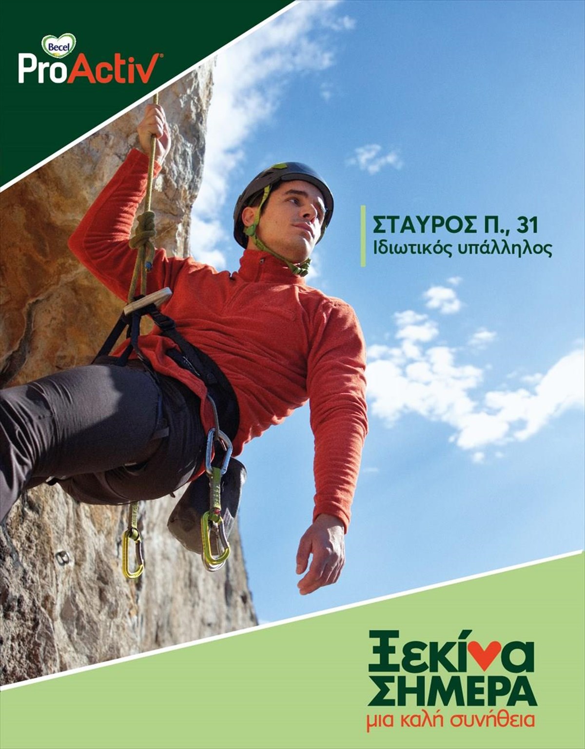 Δεν πρόκειται για ταινία, αλλά αληθινή ιστορία βασισμένη σε πραγματικά δεδομένα. Ο νεαρός «πρωταγωνιστής» που αναρριχάται ατρόμητος κάθε φορά σε νέα ύψη, δεν περίμενε ότι θα ερχόταν η στιγμή να έρθει αντιμέτωπος με το ύψος της χοληστερίνης του. Ο Σταύρος ήταν ένας μόνο από τους συμμετέχοντες στο πρόγραμμα 21 ημερών του Becel ProActiv που πραγματοποιήθηκε με την επιστημονική επίβλεψη του ΕΛ.Ι.ΚΑΡ. Σκοπός του προγράμματος ήταν να αναδείξει πως το Βecel ProActiv στην καθημερινή διατροφή βοηθάει στη μείωση της χοληστερίνης στο πλαίσιο μιας ισορροπημένης διατροφής.