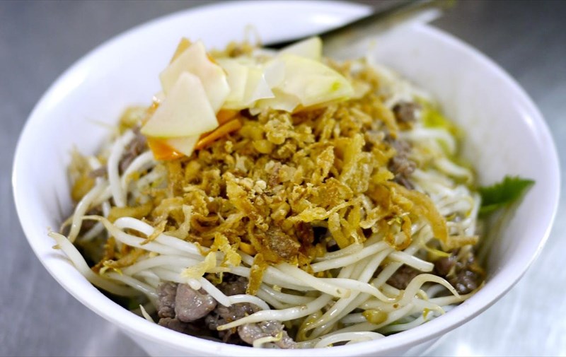 Εδώ έχουμε μια μεγάλη μερίδα από σταρένια noodles κάτω από μια στρώση ψημένου χοιρινού. Όλα αυτά περιχύνονται από τον ζωμό του χοιρινού, μαζί με φρέσκα λαχανικά και φιστίκια.