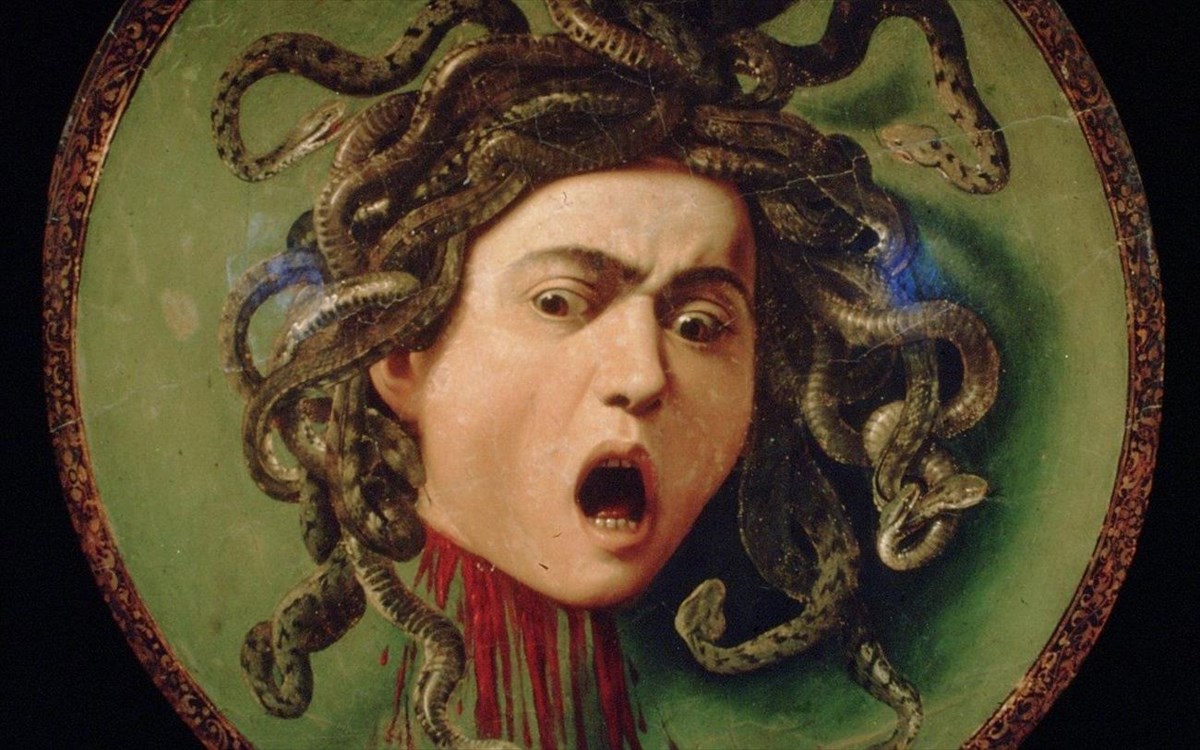 Η Μέδουσα ήταν μια από τις τρεις γοργόνες, τερατόμορφο πλάσμα με τα φίδια για μαλλιά, που μπορούσε να μεταμορφώσει σε πέτρα οτιδήποτε κοίταζε. Ήταν ανίκητη, μέχρι που ο Περσέας με τα τεχνάσματά του κατάφερε να τη σκοτώσει χρησιμοποιώντας έναν καθρέφτη και μετά δώρισε το κεφάλι της στην Αθηνά. Ο πίνακας του Caravaggio παίρνει τη μορφή ασπίδας και η Μέδουσα παρουσιάζεται στιγμιαία ζωντανή και τρομαγμένη.