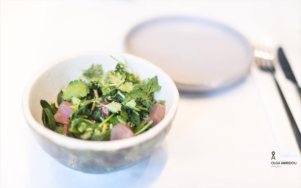Το πιάτο αυτό, λοιπόν, είναι από τα πρώτα που δοκιμάσαμε, αφού πιάσαμε μια θέση στο bar, ένα μεσημέρι καθημερινής, υπό τους ήχους τζαζ μουσικής και με τον κόσμο να έχει ήδη γεμίσει το μαγαζί. Σταμναγκάθι λουσμένο σε ζωμό dashi (γιαπωνέζικος ζωμός από καπνιστή παλαμίδα), με σουτζούκι ψιλοκομμένο και σωταρισμένο και τρυφερά κομμάτια παλαμίδας (13 ευρώ), που τελείωναν πολύ γευστικά την κάθε μπουκιά, φέρνοντας σε ισορροπία το πιάτο σε σχέση με το πικρό και σκληρό σταμναγκάθι.
