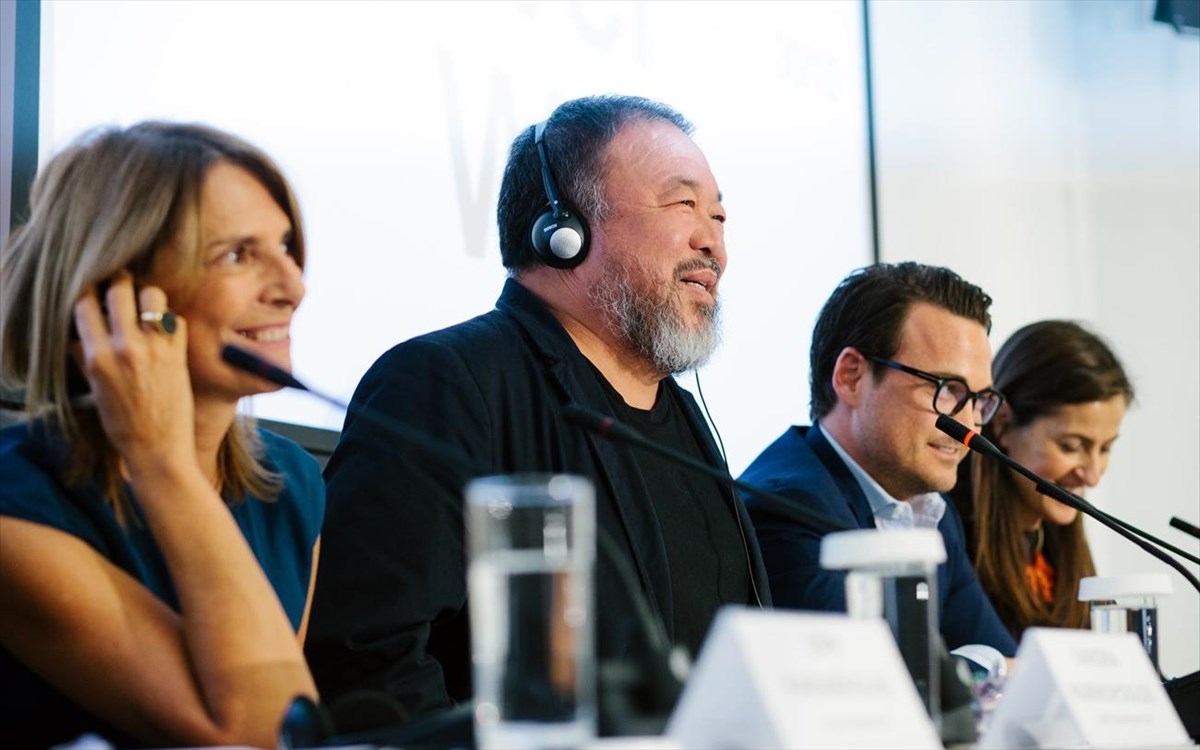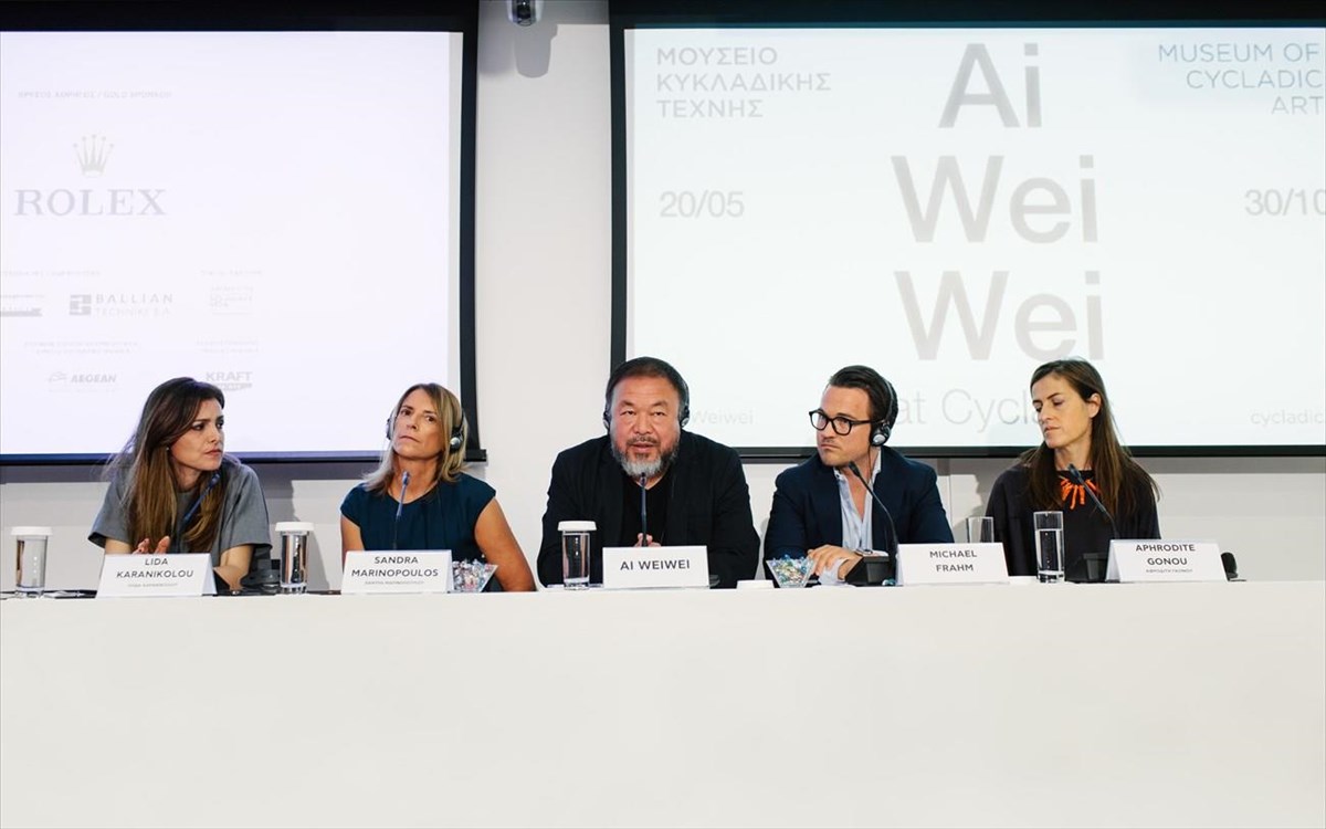 Τη συνέντευξη άνοιξε η Σάντρα Μαρινοπούλου, Πρόεδρος του Μουσείου Κυκλαδικής Τέχνης, καλωσορίζοντας το κοινό και ευχαριστώντας τον Ai Weiwei για την μεγάλη τιμή που έκανε στο Μουσείο και τους ανθρώπους του μέσα από τη συγκεκριμένη συνεργασία. «Η παρουσία του Ai Weiwei στο Μουσείο Κυκλαδικής Τέχνης έρχεται ως συνέχεια του πρωτοποριακού, υψηλής ποιότητας προγράμματος των –αρχαιολογικών και σύγχρονων– εκθέσεών μας. Η ιδέα ενός διαρκούς, δημιουργικού διαλόγου των αρχαιολογικών συλλογών με τη σύγχρονη τέχνη υλοποιείται στο Μουσείο Κυκλαδικής Τέχνης εδώ και μία δεκαετία. Ο Ai είναι ένας καλλιτέχνης ανατρεπτικός, ένας έντονα πολιτικοποιημένος ακτιβιστής αλλά ταυτόχρονα ένας ειλικρινής, ζεστός και ανοικτός άνθρωπος που συγκινήθηκε βαθιά όταν είδε για πρώτη φορά τις συλλογές του Μουσείου. Η επίσκεψή του είχε ως αποτέλεσμα τη δημιουργία ενός νέου έργου εμπνευσμένου από την κυκλαδική τέχνη, φτιαγμένου ειδικά για αυτή την έκθεση. Οι επισκέπτες θα έχουν την ευκαιρία να δουν επιλεγμένες δημιουργίες του, καθώς επίσης και νέα έργα, μεταξύ των οποίων φωτογραφίες και βίντεο που εστιάζουν στην προσφυγική κρίση».