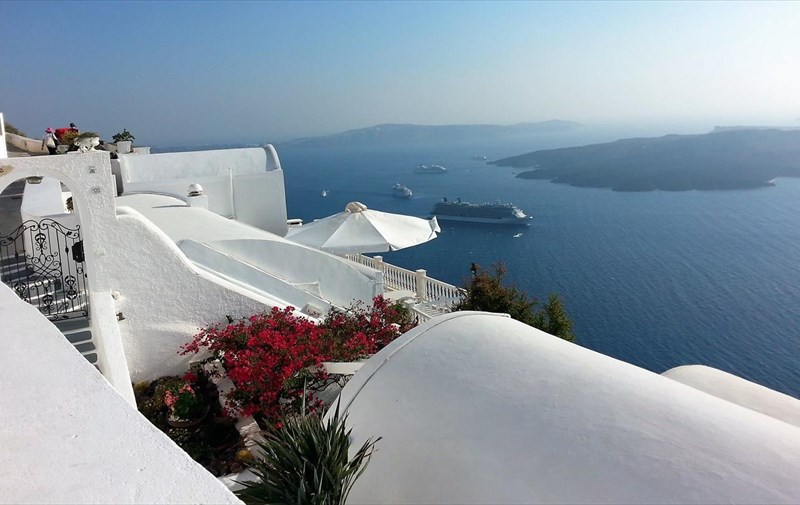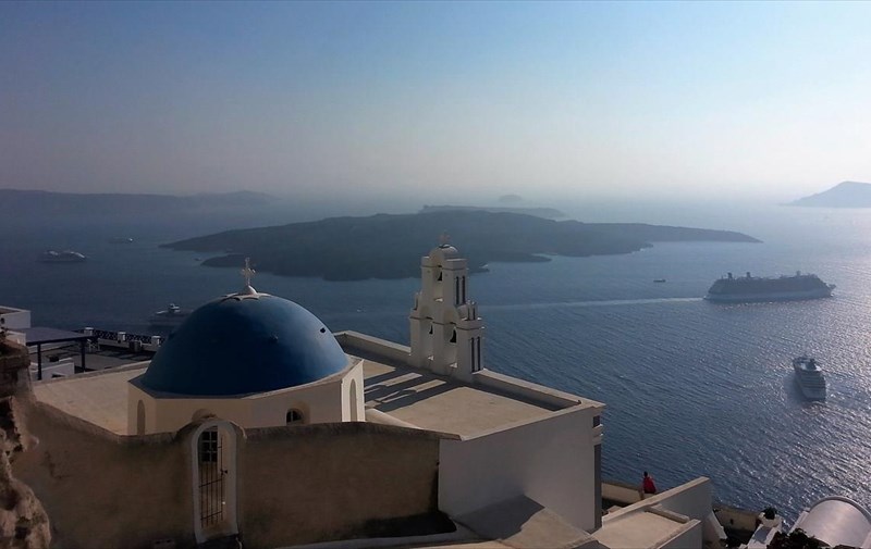 Το καράβι σταμάτησε λίγο πριν το λιμάνι της Σκάλας στις 16.00 και η αποβίβαση μέσω των λέμβων ολοκληρώθηκε εντός της επόμενης ώρας. Λίγο μετά τις 17.00, κι αφού μπήκαμε στο (πανάκριβο) τελεφερίκ, βρεθήκαμε στα Φηρά απ’ όπου και ξεκινήσαμε τη βόλτα μας. Ανηφορίζοντας για το Ημεροβίγλι, περάσαμε το Φηροστεφάνι, το οποίο και μας έκλεψε την καρδιά. Τα φωτογραφικά κλικς πήραν φωτιά, όπως και τα πόδια μας από το περπάτημα στα λιθόστρωτα καλντερίμια της Σαντορίνης, γι αυτό και αποφασίσαμε να πιούμε ένα κρασί στην απέραντη βεράντα που λέγεται Καλντέρα.