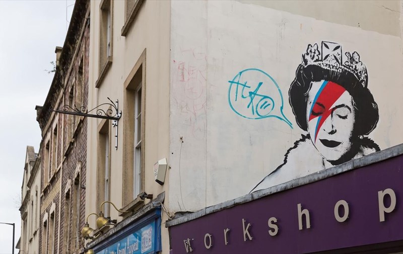 Η Βασίλισσα Ελισσάβετ σε τοίχο του Μπρίστολ με το χαρακτηριστικό κεραυνό του Ziggy Stardust στο πρόσωπο