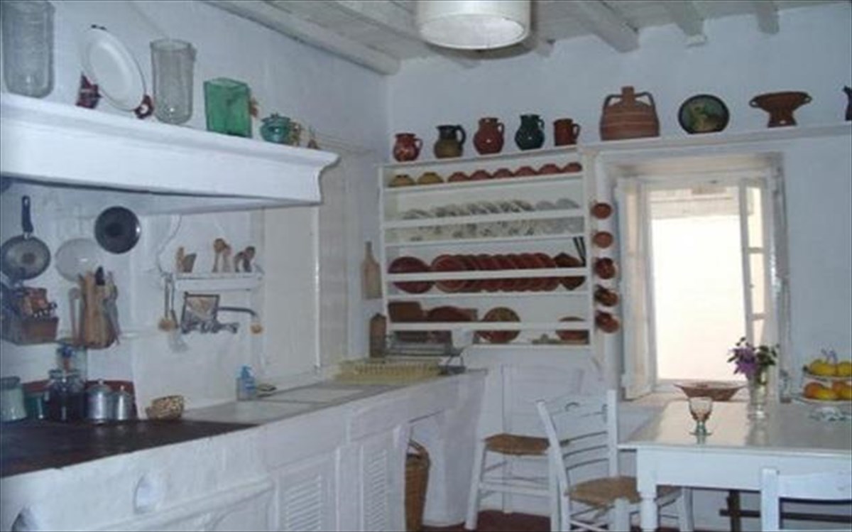 H κουζίνα του σπιτιού έχει διατηρήσει τον παραδοσιακό χαρακτήρα της νησιώτικης διακόσμησης.
