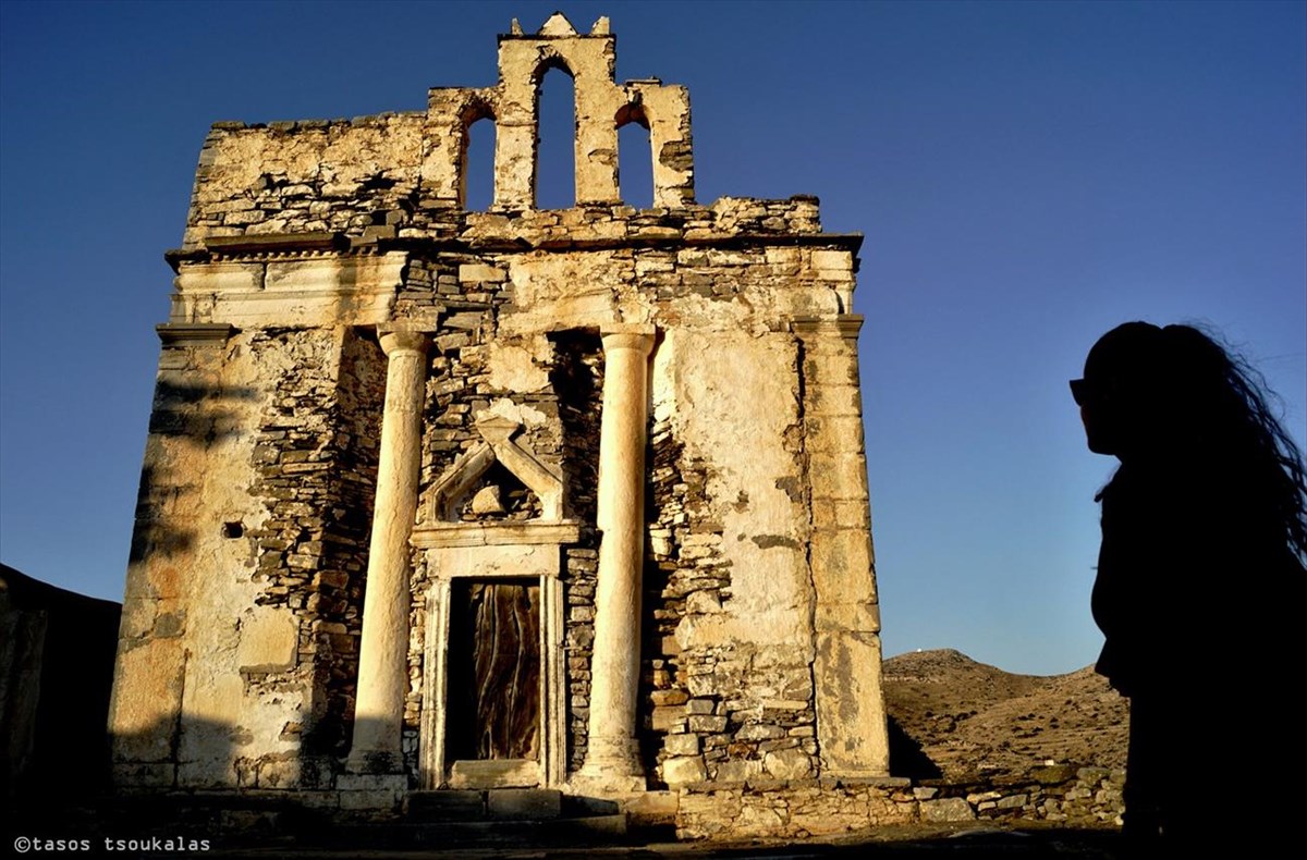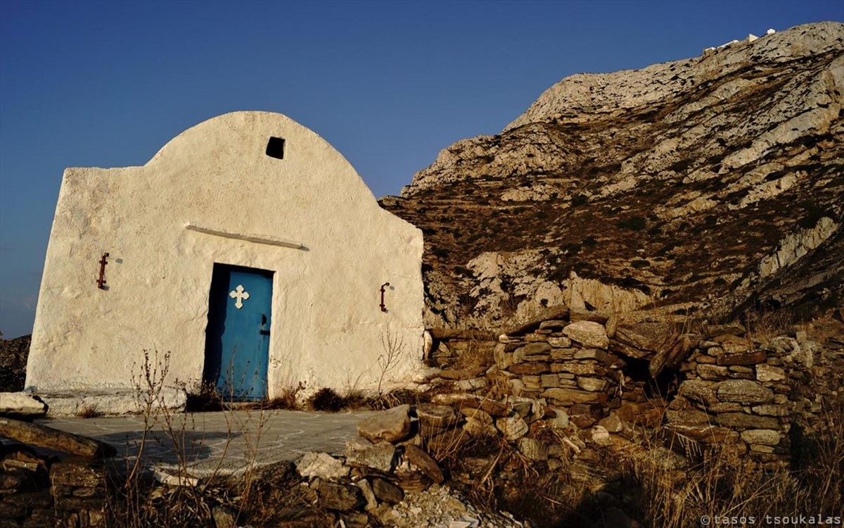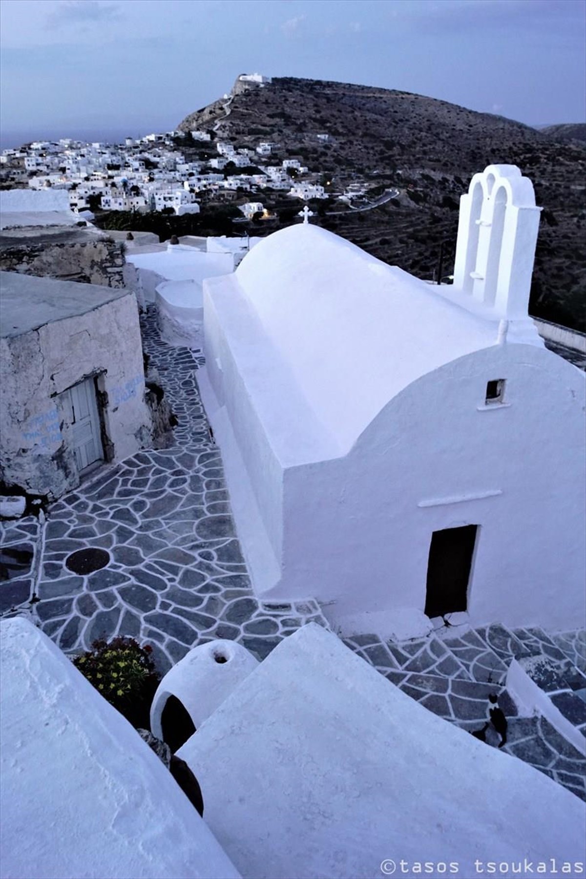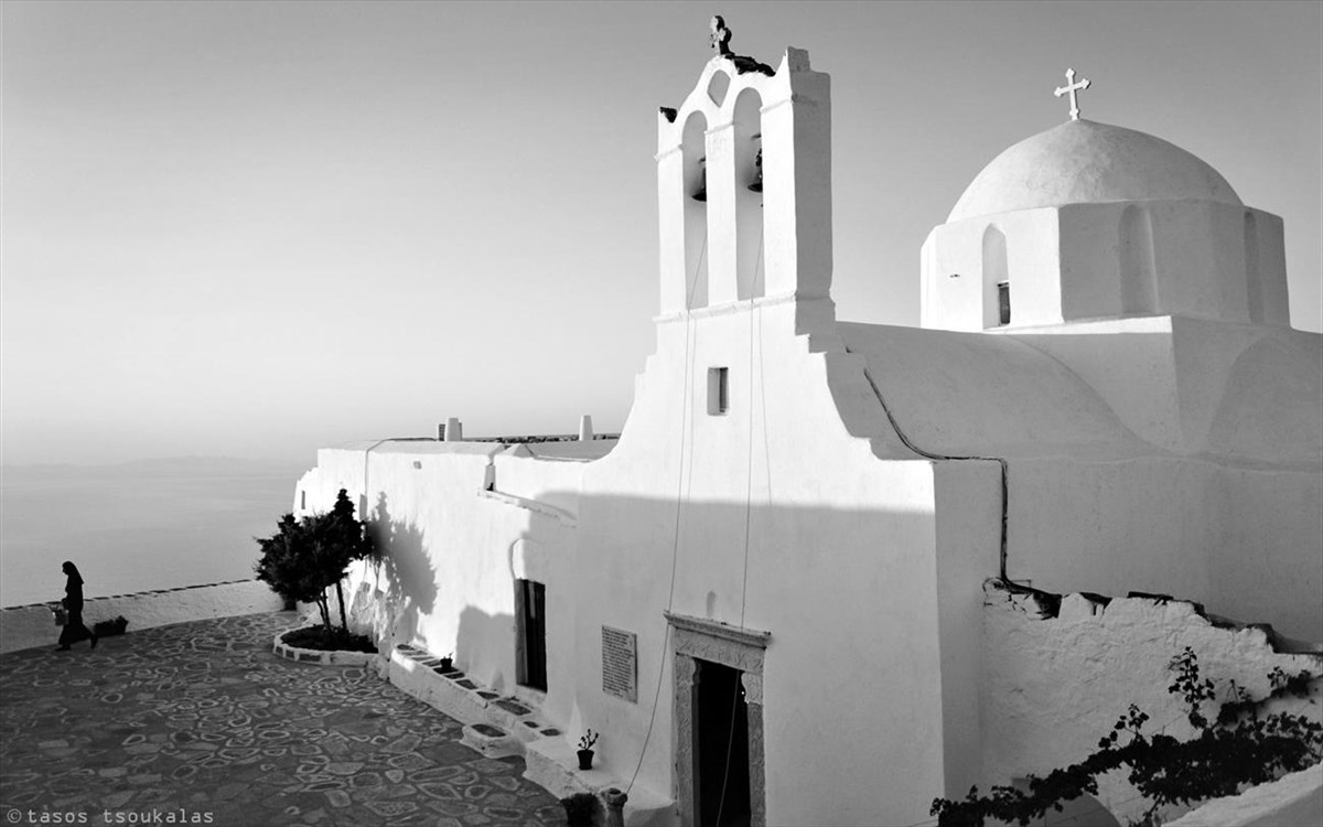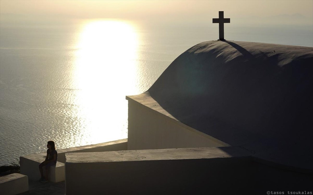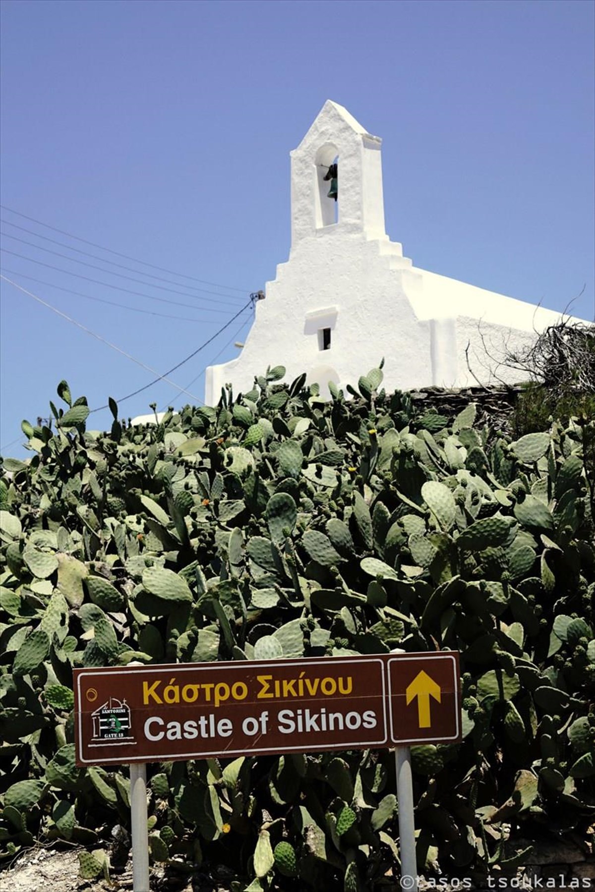 Η υπέροχη θέα από την Παναγιά Παντοχαρά, την εκκλησία αφιερωμένη στον Ελύτη, ο οποίος είχε εκφράσει την επιθυμία για την κατασκευή της, αν και δεν είχε επισκεφτεί τη Σίκινο ποτέ. Θεωρούσε, όμως, πάντα ότι εκφράζει την παρθένα, καθαρή Ελλάδα.