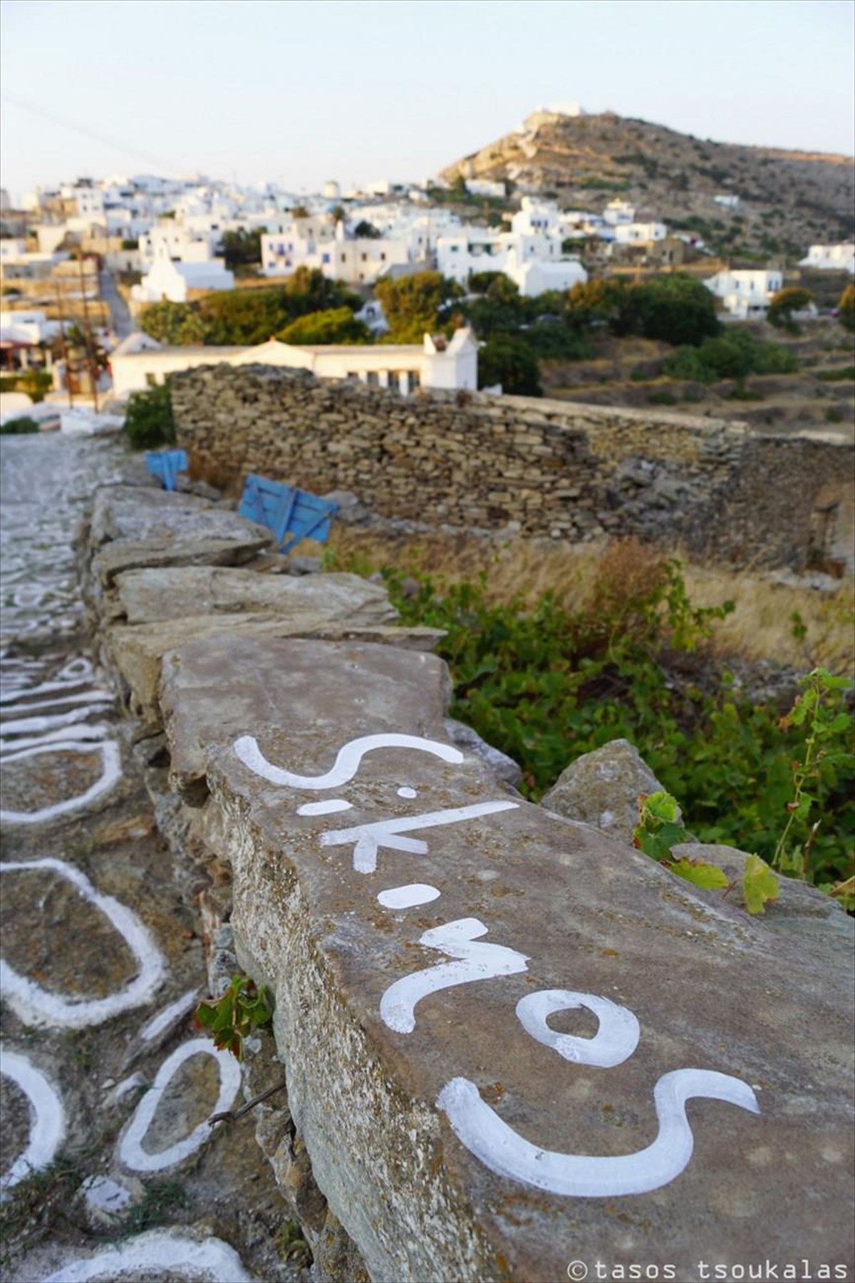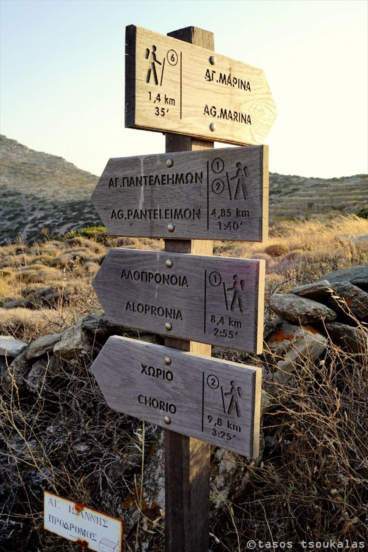 Πεζοπορικές ταμπέλες προς τα πανέμορφα μονοπάτια, για τους περιπατητές εκεί έξω. Η μεγαλύτερη διαδρομή του νησιού για να νιώσει κανείς όλη τη Σίκινο είναι η διαδρομή Κάστρο-Επισκοπή-Άγιος Παντελεήμονας-Αλοπρόνοια.