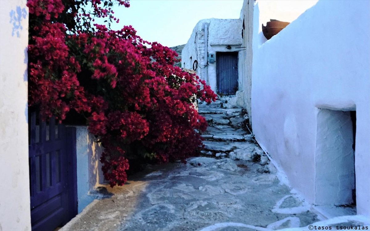 Στιγμιότυπα από το Πάνω Χωριό ή αλλιώς Χώρα, τον τρίτο οικισμό του νησιού, που αποτελεί έναν μικρό, γραφικό «λαβύρινθο» από σοκάκια, παλιά σπίτια, εκκλησίες, ανθισμένες αυλές, παρτέρια…