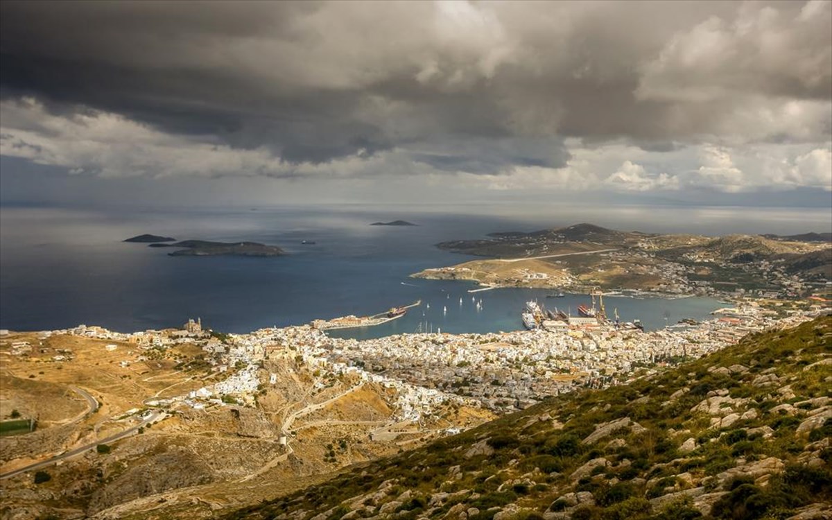 Τα πρωτοβρόχια στην Σύρο, με τα σύννεφα να σκεπάζουν την Ερμούπολη