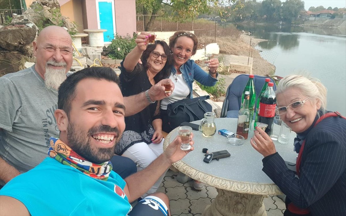 Με συγκίνησε πάρα πολύ ένας κύριος στη Σερβία –γενικά οι Σέρβοι μας θεωρούν αδέρφια τους και το συνειδητοποίησα για τα καλά στο πρότζεκτ- σε ένα άλλο μικρό χωριό, την Τσούπρια, όπου ρωτούσα πού μπορώ να μείνω και με πήγαν σε έναν κύριο 1,95 ύψος, 150 κιλά, ξυρισμένο κεφάλι, με μούσια, επάγγελμα νεκροθάφτης, ο οποίος δεν μίλαγε ούτε λέξη αγγλικά. Πραγματικά ήταν κι αυτός ένας αγαθός γίγαντας, που έμενε δίπλα στο ποτάμι σε ένα πολύ ωραίο μέρος που είχε φτιάξει με τα χέρια του, με την πέμπτη του γυναίκα. Ένας τύπος που πίνει 5 λίτρα ρακή την ημέρα, απολαμβάνει τη ζωή και με φρόντισε πάρα πολύ. Εκτός από φαγητό, μου έδωσε πράγματα για το δρόμο, μια μπλούζα με το τηλέφωνό του για να τον πάρω αν χρειαζόμουν οτιδήποτε στο δρόμο και γενικά έδειξε ένα ενδιαφέρον που με συγκίνησε και από έναν άνθρωπο που αν απλώς τον έβλεπες, χωρίς να τον γνωρίσεις, μπορεί και να φοβόσουν. Μάλιστα, θα έρθει, και στην Ελλάδα το καλοκαίρι.