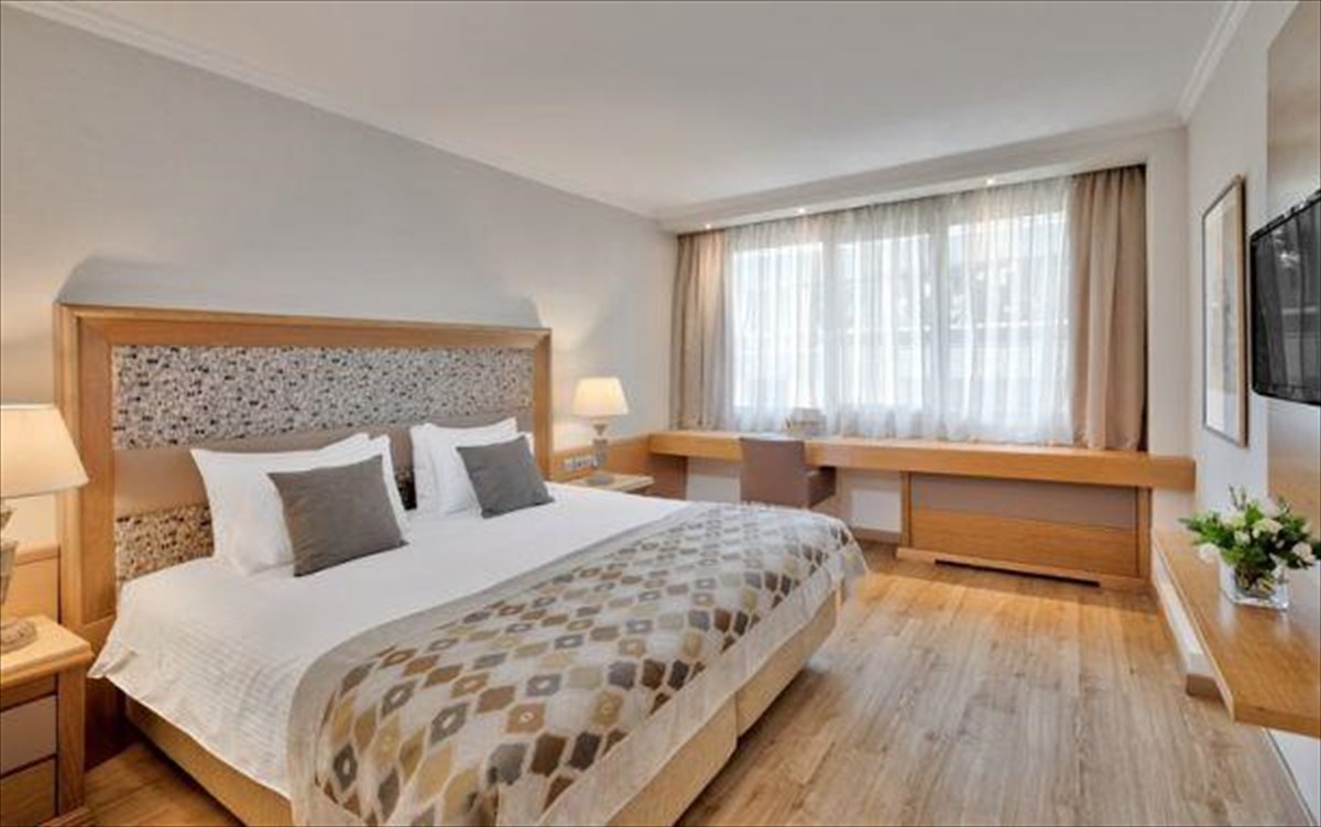 Συγκεκριμένα, στο λόμπι προστέθηκαν εντυπωσιακές ξύλινες επιφάνειες που συνδυάζονται με το ολοκαίνουργιο γεωμετρικό μαρμάρινο πάτωμα, ενώ τα δωμάτια και οι σουίτες ανασχεδιάστηκαν με λειτουργικό και εργονομικό design. Στη μοντέρνα του διακόσμηση προσθέστε και την απεριόριστη θέα στην πόλη, ενώ έμφαση δόθηκε και στη φιλοξενία οικογενειών, με τη διαμόρφωση των ειδικών family rooms.