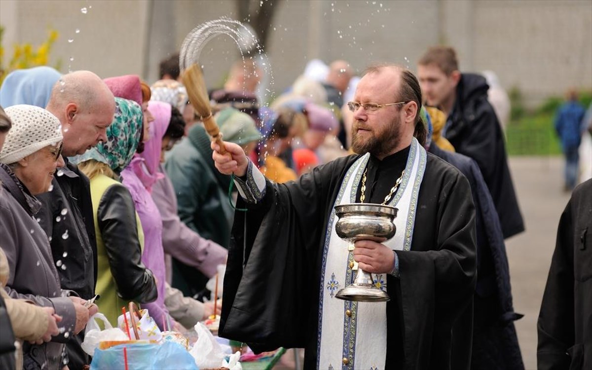 Ευλογία με αγιασμό των πασχαλινών καλαθιών σε ορθόδοξη εκκλησία στο Orel της Ρωσίας.