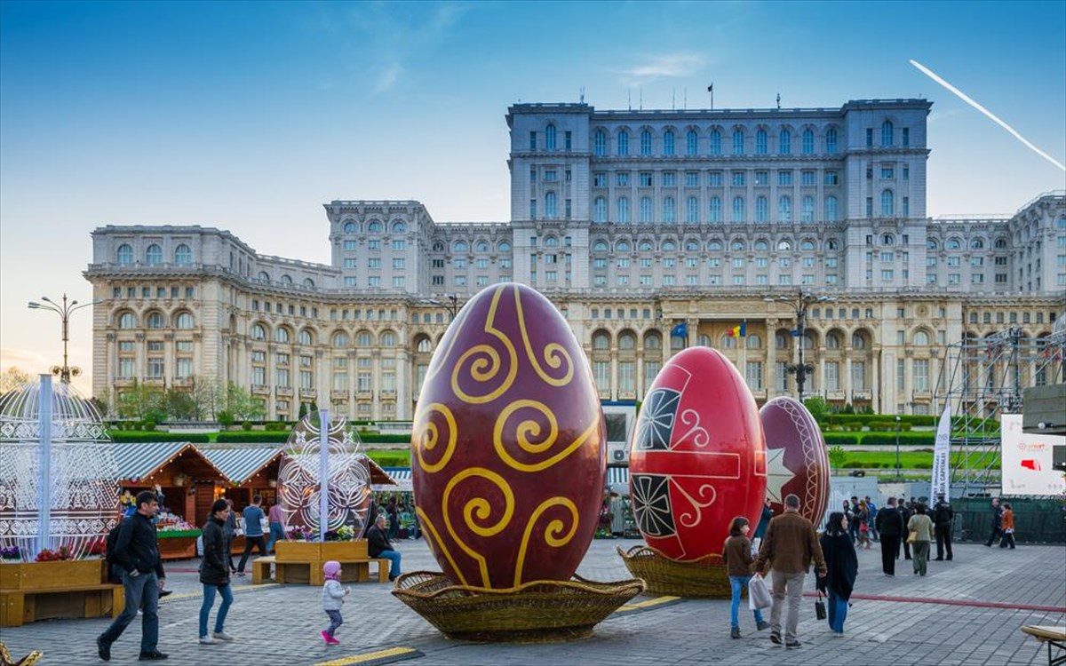 Πασχαλινή διακόσμηση στο Βουκουρέστι της Ρουμανίας, μπροστά στο κτίριο της Βουλής.