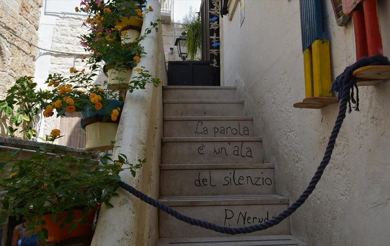 Η εξερεύνηση της πόλης καλό είναι να ξεκινάει με το σήμα κατατεθέν της και το πιο εντυπωσιακό της μέρος, την παραλία Lama Monachile Cala Porto. Από εκεί καταλαβαίνει κανείς την ιδιαιτερότητα της πόλης, είναι χτισμένη στην άκρη μιας χαράδρας γεμάτης σπηλιές- στην άκρη όμως. Η χαράδρα έτσι αποτελεί το σύνορο για τα δύο χαρακτηριστικά στοιχεία που συναποτελούν το Polignano, την αλμύρα και την ποίηση. Πάνω στη χαράδρα βλέπεις απλώνεται το ιστορικό κέντρο της πόλης, και μάντεψε, είναι γεμάτο φτιασιδωμένα σοκάκια και ταράτσες που βλέπουν στη θάλασσα. Κυρίαρχα χρώματα είναι το μπεζ, το πράσινο και το καφέ, βασικός στολισμός είναι τα λουλούδια και κεντρική διάθεση είναι η ποιητική καθώς σε πολλούς ελεύθερους χώρους είναι γραμμένα ρητά μεγάλων προσωπικοτήτων- ανάμεσά τους ο Ευρυπίδης και ο Σεφέρης.