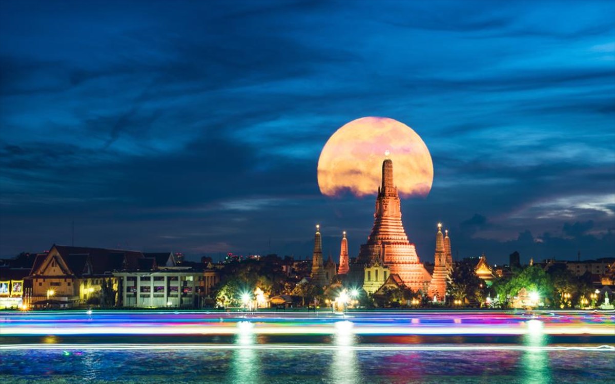 Η υπερπανσέληνος, όπως φανερώνει και η λέξη, είναι όταν το φεγγάρι είναι το μεγαλύτερο που μπορεί να υπάρξει. Εδώ την απολαμβάνουμε πάνω από τον βουδιστικό ναό Wat Arun, στην πρωτεύουσα της Ταϊλάνδης.
