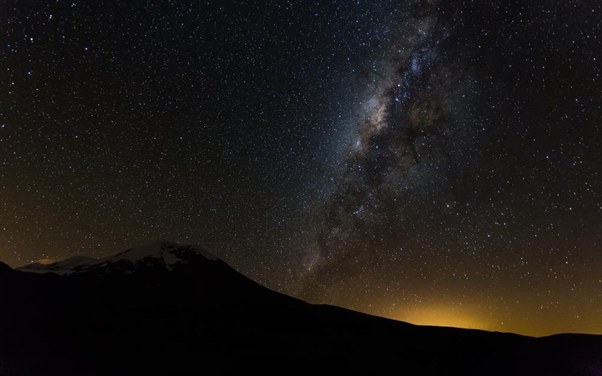 Το Τσιμποράσο είναι προς το παρόν αδρανές ηφαίστειο στην Κορδιλιέρα Οξιδεντάλ του Ισημερινού, στις Άνδεις, με ύψος 6.268 μέτρα, αποτελώντας την υψηλότερη κορυφή που βρίσκεται κοντά στον ισημερινό. Αν και δεν είναι η υψηλότερη κορυφή του κόσμου, όταν μετράται από το επίπεδο της θάλασσας, η κορυφή του Τσιμποράσο είναι το σημείο που απέχει περισσότερο από το κέντρο της Γης. Στο φόντο της φωτογραφίας, βλέπουμε και πάλι τον Γαλαξία μας.