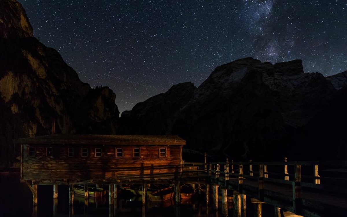 Μια λίμνη εξαιρετικής ομορφιάς και με υπέροχη τοποθεσία στους Δολομίτες, σε υψόμετρο 1496 μέτρα, η λίμνη Prags ή Braies είναι τιρκουάζ το καλοκαίρι και παγωμένη τον χειμώνα. Εδώ φωτίζεται κάτω από τον έναστρο ουρανό.