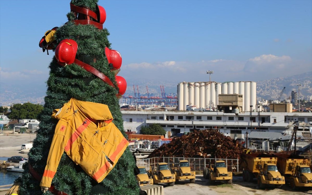REUTERS / ISSAM ABDALLAHΚοντά στην κατεστραμμένη είσοδο του λιμανιού, ένας καλλιτέχνης έστησε ένα πανύψηλο χριστουγεννιάτικο δέντρο διακοσμημένο όχι με λαμπερά στολίδια, αλλά με τις προστατευτικές στολές και τα καπέλα που φορούσαν πυροσβέστες όταν αναμετρήθηκαν με τη φωτιά στο λιμάνι.