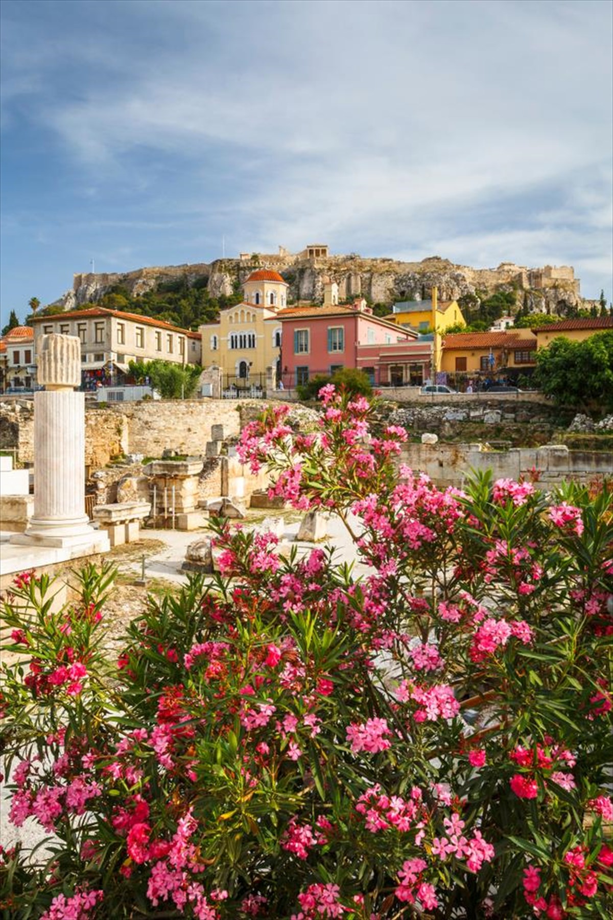 Βιβλιοθήκη του Αδριανού στο Μοναστηράκι, βόρεια της Ακρόπολης, μια ανοιξιάτικη ημέρα