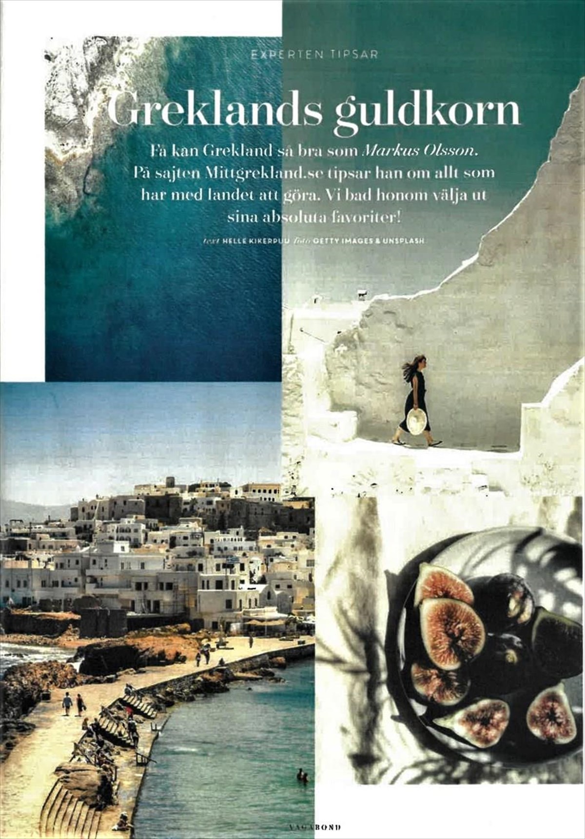 Ο σουηδός δημοσιογράφος-travel blogger και ιδρυτής της ταξιδιωτικής ιστοσελίδας «MittGrekland», Markus Olsson, αποκάλυψε τους 10 αγαπημένους του προορισμούς στην Ελλάδα, στο μεγαλύτερο ταξιδιωτικό περιοδικό της Σουηδίας «Vagabond» υπό τον τίτλο «Οι χρυσοί κόκκοι της Ελλάδας» (Greklands guldkorn).