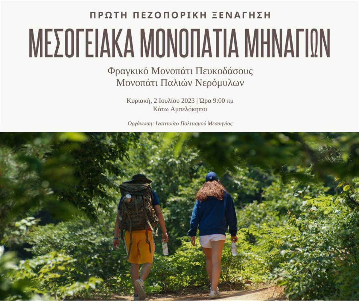 Στο πλαίσιο της ανάδειξης του δικτύου των Μεσογειακών Μονοπατιών Μηναγίων, το Ινστιτούτο Πολιτισμού Μεσσηνίας σας προσκαλεί στην πρώτη πεζοπορική ξενάγηση στο νέο Φραγκικό Μονοπάτι Πευκοδάσους. Το νέο μονοπάτι μήκους 5,5 χιλιομέτρων ξεκινάει από τον ιστορικό οικισμό των Κάτω Αμπελοκήπων, διαπερνάει το μοναδικό αυτοφυές πευκοδάσος της Νότιας Μεσσηνίας και καταλήγει στην κορυφή επιβλητικού φυσικού οχυρού λόφου με συστοιχία βράχων (Βγενόβραχος) όπου βρίσκονται τα ερείπια του φραγκικού κάστρου «Molines» με την εντυπωσιακή θέα. Παράλληλα, θα υπάρξει ξενάγηση και στο μικρό Μονοπάτι Παλιών Νερόμυλων μήκους 1 χιλιομέτρου με την εντυπωσιακή δενδρώδη βλάστηση και τον ιστορικό καταρράκτη «Παλιόμυλου».