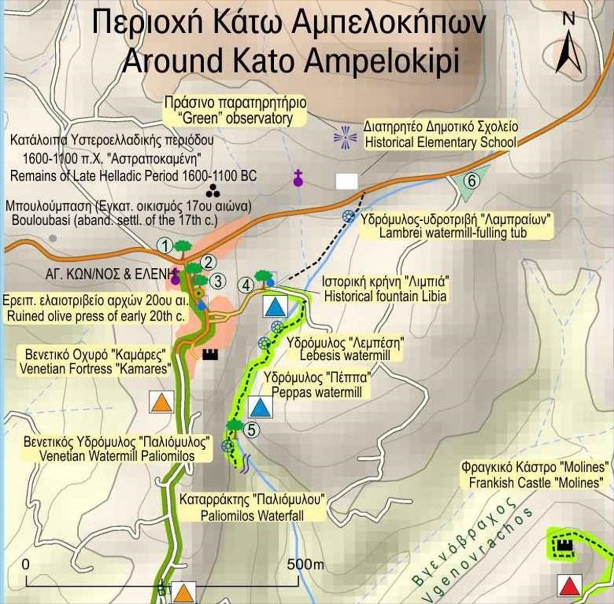 Σε σχέση με τα ενδιαφέροντα στοιχεία της εν λόγω διαδρομής, εντός των ορίων του οικισμού των Κάτω Αμπελοκήπων όλοι οι πεζοπόροι θα δείτε το ιστορικό διατηρητέο δημοτικό σχολείο, που αποτέλεσε Αρχηγείο Εθνικής Αντίστασης Νότιας Μεσσηνίας κατά τη διάρκεια του Β΄ Παγκοσμίου πολέμου, καθώς και το πρώτο Πάρκο Ελληνικής Επανάστασης στην Ελλάδα που εγκαινιάστηκε πρόσφατα. Επίσης, στην είσοδο του οικισμού θα θαυμάσετε 3 μνημειακά δέντρα (ελιά, πρίνος, λυγαριά) του Δικτύου Αιωνόβιων Δέντρων Ελληνικής Επανάστασης (υποψήφιο προς ένταξη στο Εθνικό Ευρετήριο Άυλης Πολιτιστικής Κληρονομιάς της UNESCO) και μεταξύ αυτών την γηραιότερη λυγαριά της Ελλάδας που αυτές τις μέρες θα είναι ανθισμένη. Ακολούθως, στην είσοδο του Μονοπατιού Παλιών Νερόμυλων, θα δείτε την εντυπωσιακή βελανιδιά που έχει ενταχθεί στο παραπάνω δίκτυο καθώς και την ιστορική κρήνη του οικισμού (έργο του 1908). Εντός του εν λόγω μονοπατιού με τα εντυπωσιακά δέντρα (πλάτανοι, σφένδαμοι, κυπαρίσσια, βελανιδιές κα.) και τις μικρές λιμνούλες με τα κρυστάλλινα νερά βρίσκονται και τα ερείπια δύο υδρόμυλων, ενώ το μονοπάτι καταλήγει στον καταρράκτη «Παλιόμυλου».