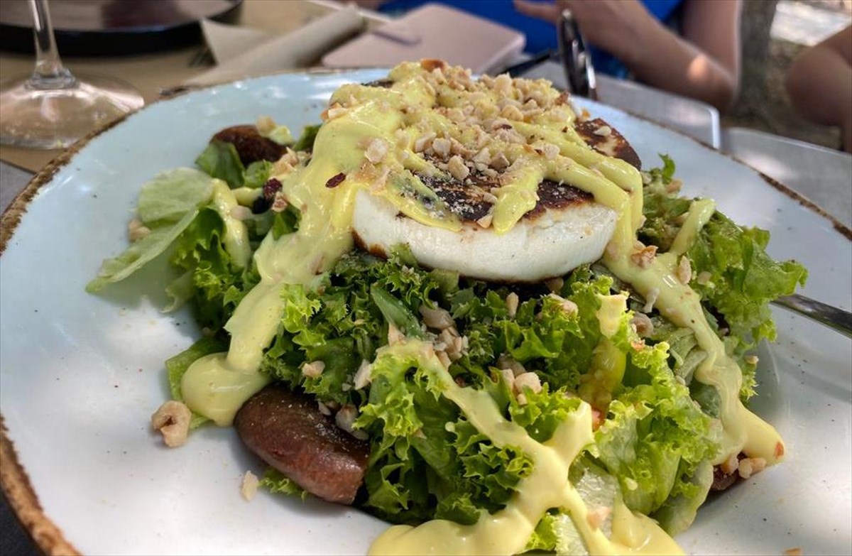 ‘Όλοι έβαλαν ένα χεράκι και φτιάχτηκε μια σαλάτα με ό,τι λαχανικό και φρούτο υπάρχει αυτή την εποχή, με μέλι, εξαιρετικά παρθένο ελαιόλαδο και ξύδι από ρόδια (Σταγόνες) και ελιές από τον Αγροτικό Συνεταιρισμό Ροβιών.