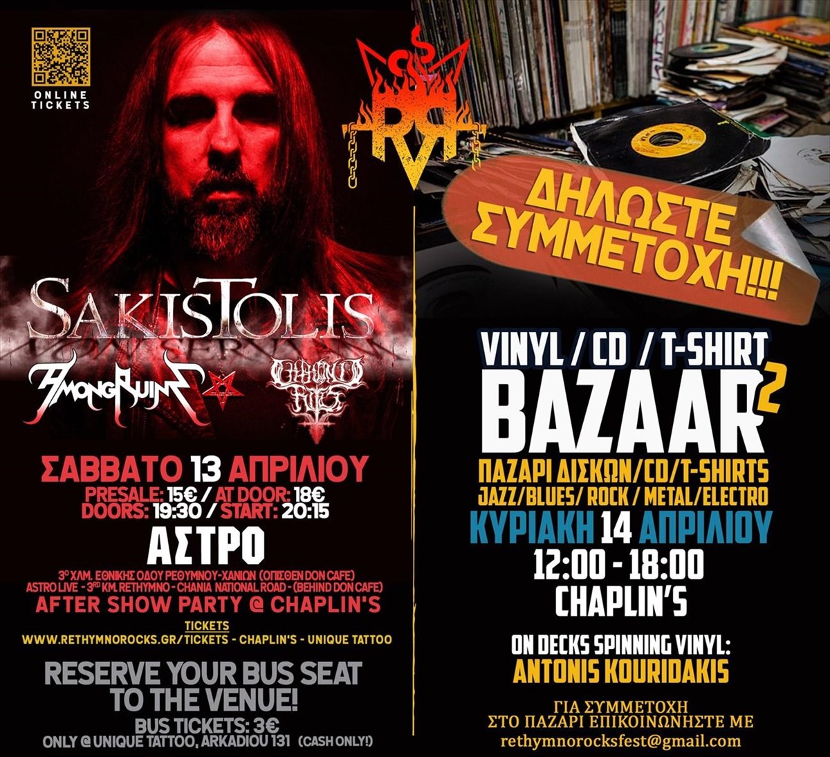 Πριν από όλα αυτά όμως (τα οποία θα παρουσιάσουμε πιο αναλυτικά), διοργανώνονται 2 εκδηλώσεις το προσεχές Σαββατοκύριακο. Η διοργάνωση του Rethymno Rocks υποδέχεται τον Σάκη Τόλη, αρχηγό των Rotting Christ με το προσωπικό του σχήμα, το Σάββατο 13 Απριλίου στο club Astro Live. Μαζί του θα είναι οι Amongruins και οι Chthonic Rites. Την επόμενη ημέρα, Κυριακή 14 Απριλίου, διοργανώνεται bazaar δίσκων, cd και t-shirts στο Chaplin's, στην παραλία του Ρεθύμνου, από τις 12.00 το μεσημέρι μέχρι τις 18.00 το απόγευμα.