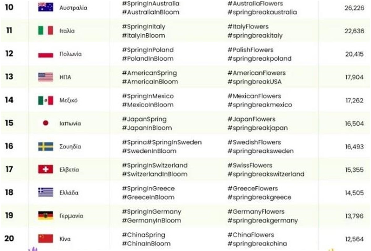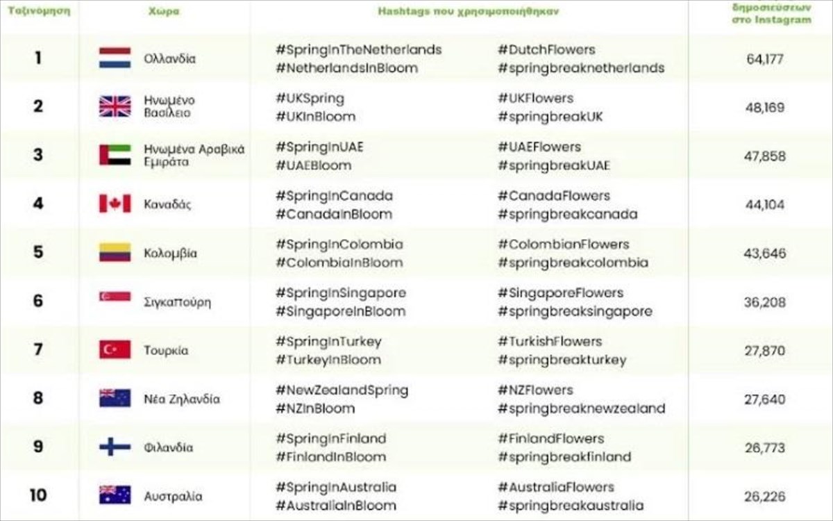Η Ολλανδία κατέκτησε και φέτος την πρώτη θέση, με 64.177 δημοσιεύσεις στο Instagram, η πλειονότητα εκ των οποίων προέρχεται από το hashtag #DutchFlowers, το οποίο χρησιμοποιήθηκε 61.461 φορές. Τα διάσημα χωράφια με τις τουλίπες της χώρας είναι βέβαιο ότι την έχουν βοηθήσει να κατακτήσει την πρώτη θέση. Στη δεύτερη θέση, το Ηνωμένο Βασίλειο σημείωσε 48.169. Ακολούθησαν τα Ηνωμένα Αραβικά Εμιράτα με 47.858 συνδυαστικές αναρτήσεις. Στην τέταρτη θέση, ο Καναδάς είχε 44.104 συνδυαστικές αναρτήσεις. Ακολούθησε η Κολομβία, η οποία σημείωσε 43.646, με την πλειοψηφία αυτών των αναρτήσεων να φέρουν ετικέτα #ColombianFlowers, με 43.576. Η Σιγκαπούρη βρέθηκε στην 6η θέση, με συνολική βαθμολογία 36.208 και ένα τεράστιο αριθμό 35.846 αναρτήσεων με ετικέτα #SingaporeFlowers. Αυτή η πόλη-κράτος αποκαλείται με αγάπη «Η Πόλη των Κήπων», λόγω της δέσμευσής της να δημιουργεί και να διατηρεί υπέροχους χώρους πρασίνου και πάρκα. Στην έβδομη θέση, η Τουρκία επισημάνθηκε 27.870 φορές σε δημοσιεύσεις σχετικά με την άνοιξη. Και παρ’ όλο που η Ολλανδία φημίζεται για τις τουλίπες της, στην πραγματικότητα προέρχονται από την Τουρκία. Το ετήσιο φεστιβάλ τουλίπας της Κωνσταντινούπολης διαρκεί όλο τον Απρίλιο και τόσο οι επισκέπτες όσο και οι ντόπιοι θα απολαύσουν τα 30 εκατομμύρια λουλούδια που φυτεύονται σε όλη την πόλη.