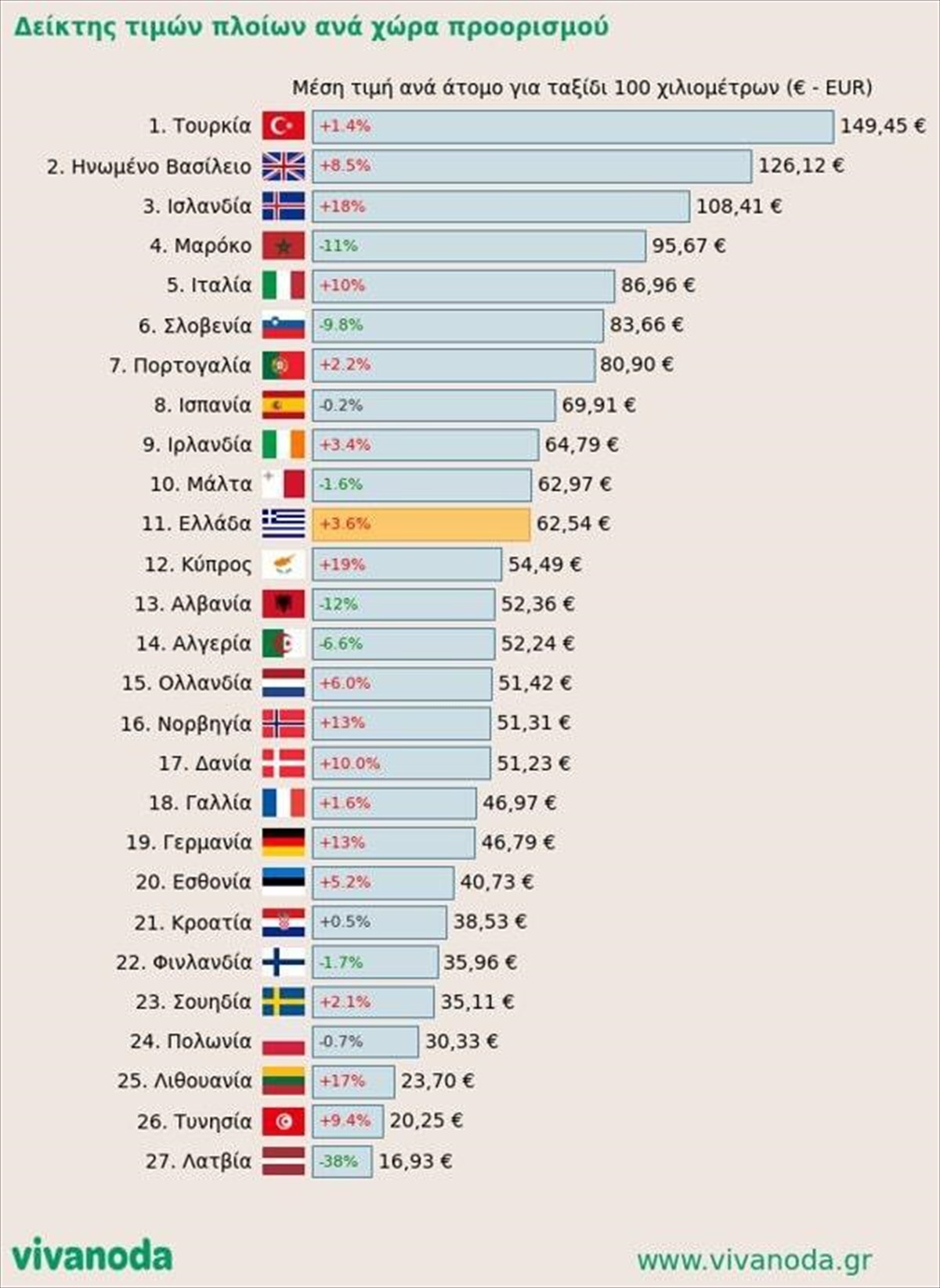 - Αντίθετα, οι ακτοπλοϊκές διελεύσεις προς την Τουρκία, το Ηνωμένο Βασίλειο και το Μαρόκο έχουν τους υψηλότερους δείκτες τιμών.