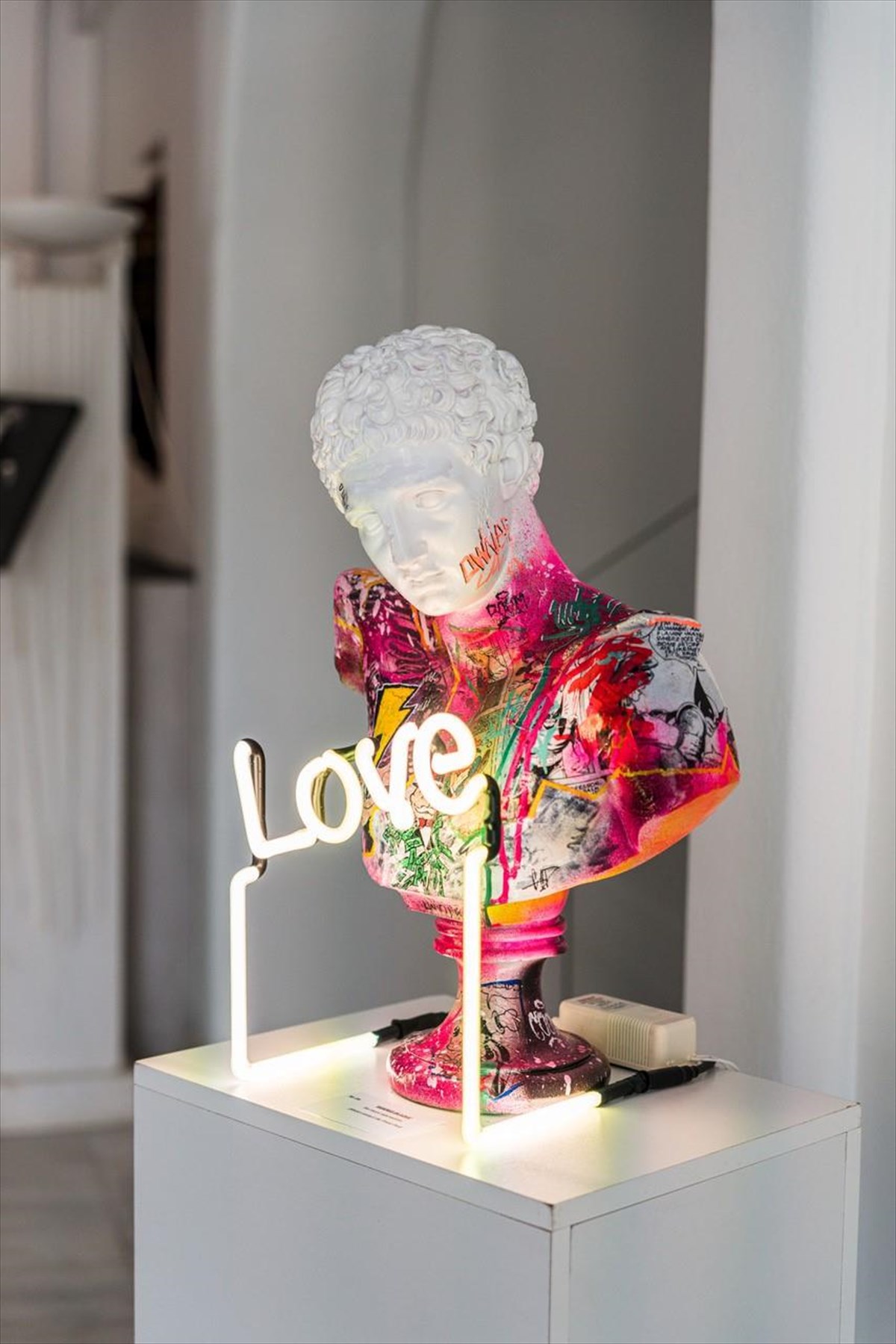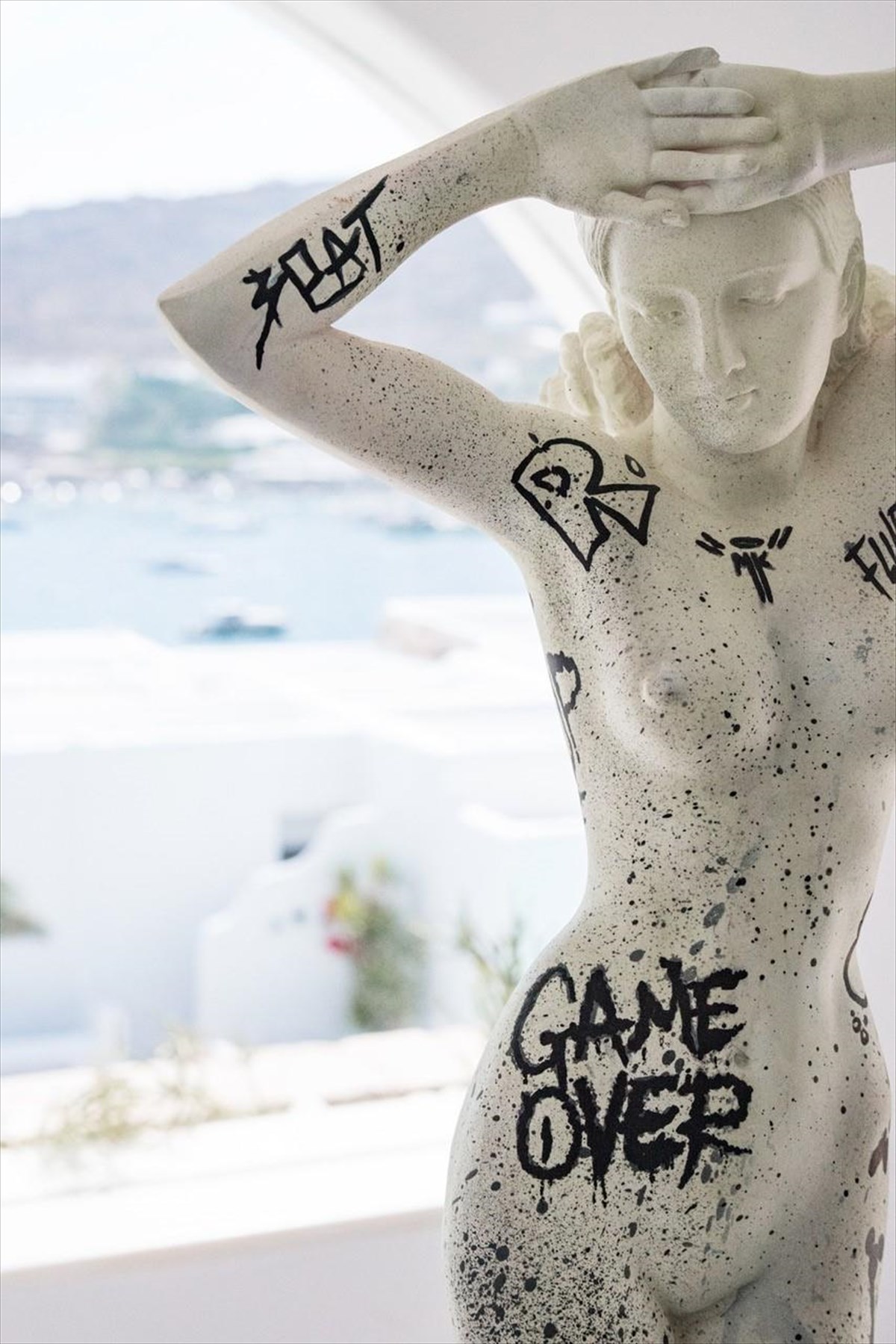 Ο σύγχρονος Έλληνας καλλιτέχνης Μιχάλης Κολώνης ενσωματώνει τη πλούσια ιστορία τέχνης της χώρας του στα έργα του που ανατρέχουν στην αρχαία Ελλάδα. Ο Μιχάλης ξεκίνησε την καριέρα του ως καλλιτέχνης σε ηλικία δεκαπέντε ετών και έχει αναπτύξει διάφορες τεχνικές με την πάροδο των χρόνων. Εργάζεται κυρίως με γλυπτά από αλάβαστρο, σπρέι και μαρκαδόρους, δημιουργώντας πολύχρωμα έργα τέχνης γεμάτα αντιθέσεις – όχι μόνο οπτικές, αλλά και σημασιολογικές. Τα γλυπτά που χρησιμοποιεί απεικόνιζαν θεούς από την ελληνική μυθολογία και τα πρότυπα ομορφιάς της εποχής. Με σπρέι και μαρκαδόρους, καλύπτει τις αρχαίες θεότητες με σύμβολα, σημάδια και ετικέτες που αντικατοπτρίζουν τις σύγχρονες πολιτιστικές “ψυχώσεις” – τι σκέφτεται και τι ονειρεύεται ο πολιτισμός του 21ου αιώνα.