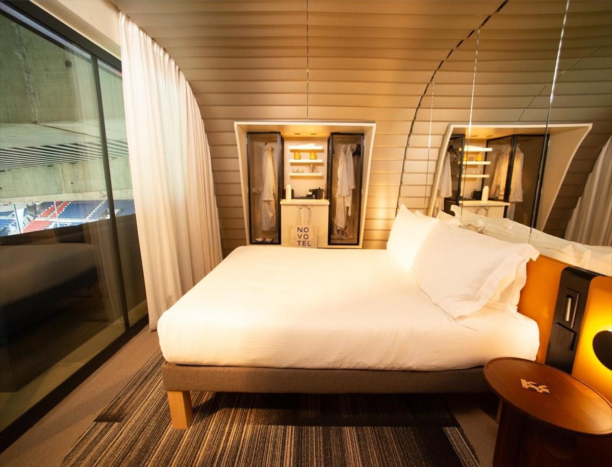 Τοποθετημένο μέσα στο στάδιο το "La Suite Novotel by ALL.com” έχει σχεδιαστεί με το signature design concept “Hypothesis” της Novotel, διασφαλίζοντας ότι κάθε πτυχή του δωματίου αποπνέει κομψότητα και άνεση. Το δωμάτιο διαθέτει ένα queen-size κρεβάτι, ensuite μπάνιο, mini bar και τηλεόραση ιδανική για να απολαύσει κανείς τα replay των αξέχαστων στιγμών στον αγωνιστικό χώρο. Ένα επιπλέον μονό κρεβάτι μπορεί να προστεθεί για να φιλοξενήσει τους νεότερους επισκέπτες, κάνοντάς το ιδανικό για οικογένειες που επιθυμούν να ζήσουν την απόλυτη ποδοσφαιρική εμπειρία. Ένα από τα πιο εντυπωσιακά χαρακτηριστικά του "La Suite Novotel by ALL.com” είναι η ιδιωτική του βεράντα με θέα στον αγωνιστικό χώρο. Από εδώ, οι επισκέπτες μπορούν να απολαύσουν τον αγώνα με ιδιωτικότητα βιώνοντας παράλληλα την ηλεκτρισμένη ατμόσφαιρα που μόνο εντός του γηπέδου μπορεί κανείς να νιώσει.