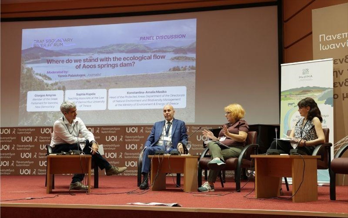 © Yorgos Gounezos - MedINAΤα ποτάμια οικοσυστήματα αντιμετωπίζουν ολοένα και μεγαλύτερες απειλές από τον κατακερματισμό και την ανάπτυξη υδροηλεκτρικών έργων, τις αλλαγές χρήσεων γης, την κλιματική κρίση και τη ρύπανση, που απειλούν την οικολογική τους ακεραιότητα. Σε αυτό το πλαίσιο, ο Μανώλης Χριστοδουλάκης, Βουλευτής Ανατολικής Αττικής, Υπεύθυνος του Τομέα Περιβάλλοντος της Κοινοβουλευτικής Ομάδας ΠΑΣΟΚ-ΚΙΝΑΛ, μίλησε για τη σημασία του χωροταξικού και περιβαλλοντικού σχεδιασμού για την ορθή χωροθέτηση των δραστηριοτήτων, τονίζοντας επίσης πως «Τα διακρατικά ποτάμια θα έπρεπε να μας ενώνουν και να αποτελούν πεδίο συνεργασίας και όχι συγκρούσεων». Ο Γιώργος Αμυράς, Βουλευτής Ν.Δ. Ιωαννίνων, ενημέρωσε ότι πρόσφατα κατέθεσε ερώτηση στη Βουλή για την οικολογική παροχή του φράγματος στις Πηγές του Αώου και στάθηκε στην προεργασία που έχει ήδη γίνει σε διακρατικό επίπεδο με την αλβανική πλευρά, με στόχο την από κοινού συνεργασία για τη δημιουργία του Διασυνοριακού Πάρκου Αώου/Vjosa.
