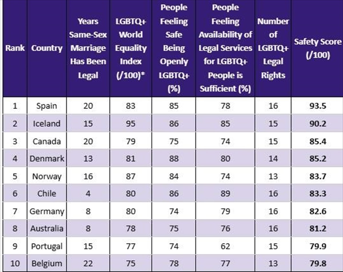 Στην άλλη πλευρά της κατάταξης, λιγότερο ασφαλείς θεωρούνται χώρες όπου ο γάμος έχει μόλις πρόσφατα θεσμοθετηθεί. Στην τελευταία θέση βρέθηκε το Λιχτενστάιν, με μόλις 30,3/100, ακολουθούμενο από το Νεπάλ (33,4/100) και την Ταϊβάν (36,3/100). Παρότι έχουν κάνει σημαντικά βήματα προς τα εμπρός με τη νομιμοποίηση των γάμων, η έλλειψη κοινωνικών δεδομένων και χαμηλότερο επίπεδο δικαιωμάτων οδηγούν σε χαμηλή βαθμολογία ασφαλείας.